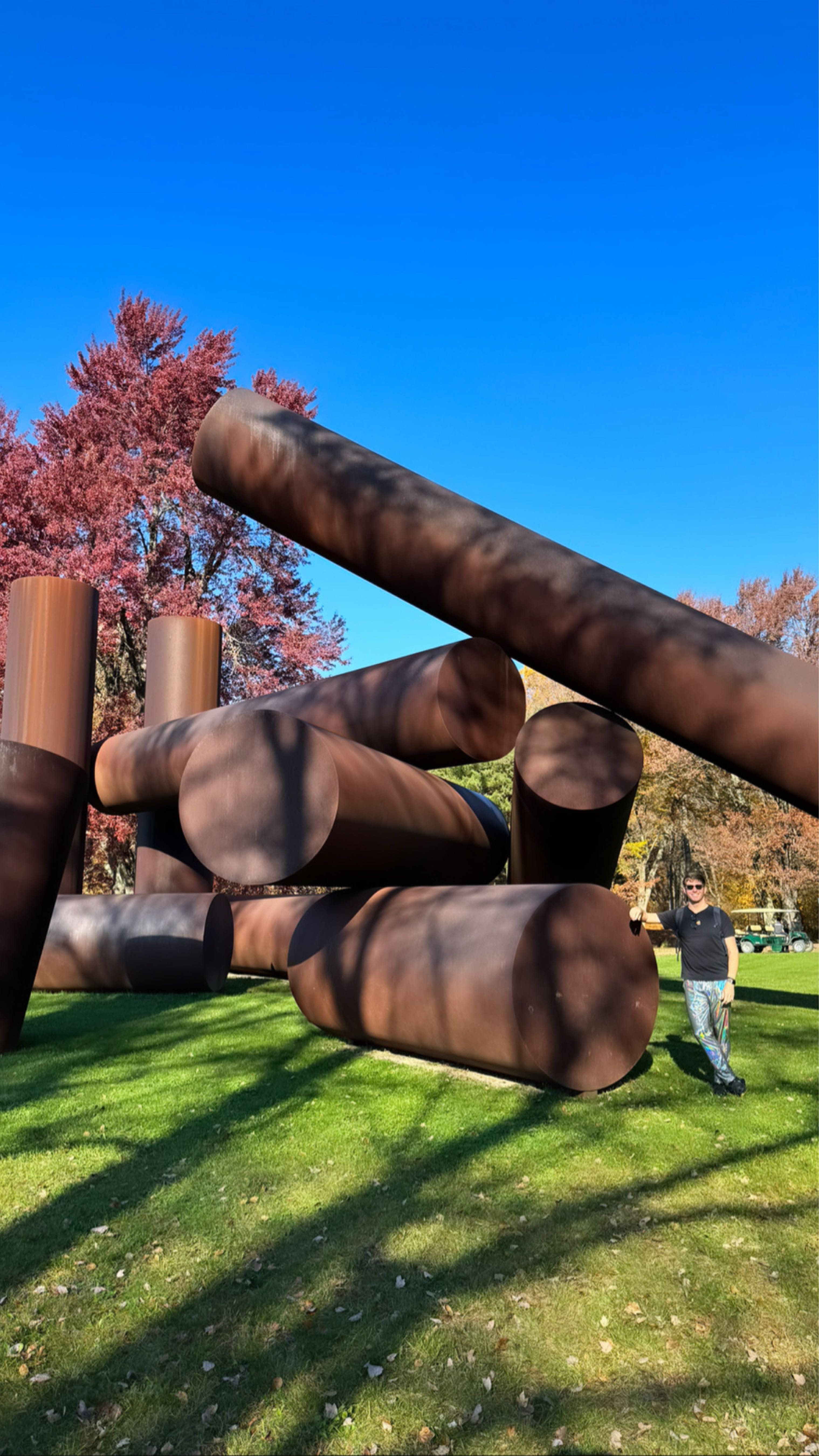 A monumental outdoor sculpture composed of multiple large-scale cylindrical steel forms — some vertical, some horizontal, some diagonal — arranged to evoke both architectural and natural references, including fallen columns, trees, and cathedral architecture. Originally created 1970–71 using six-foot-long gas storage tanks and refabricated in 2000 after physical deterioration of the original rusted steel. Liberman cited the medieval cathedral at Chartres, France as his primary inspiration, positioning vertical cylinders as a portal and a horizontal cylinder as a nave. The title 'Adonai' is the Hebrew word for 'god,' consistent with Liberman's use of biblical and mythological titling across his sculptural oeuvre.