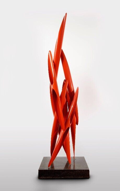 McCracken's sleek monochromatic minimalist sculptures in industrial materials share a visual kinship with Liberman's geometric steel works, particularly in their use of bold singular color and reduced form.