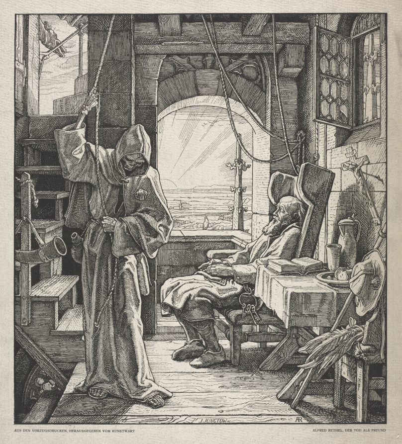 Part of Rethel's haunting reimagining of the medieval Dance of Death tradition, this woodcut presents the grim reaper as a deceptively benevolent companion, reflecting 19th-century anxieties about mortality and social upheaval.
