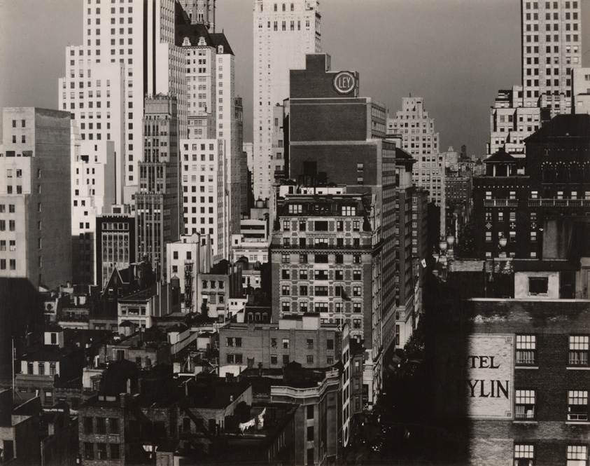 Urban architecture viewed from the photographer's gallery space creates a geometric composition that bridges his earlier cityscapes with his mature modernist vision.