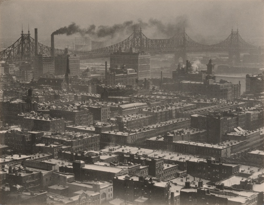 Shot from the high-rise apartment he shared with Georgia O'Keeffe, this aerial perspective captures the dramatic verticality and energy of 1920s Manhattan.