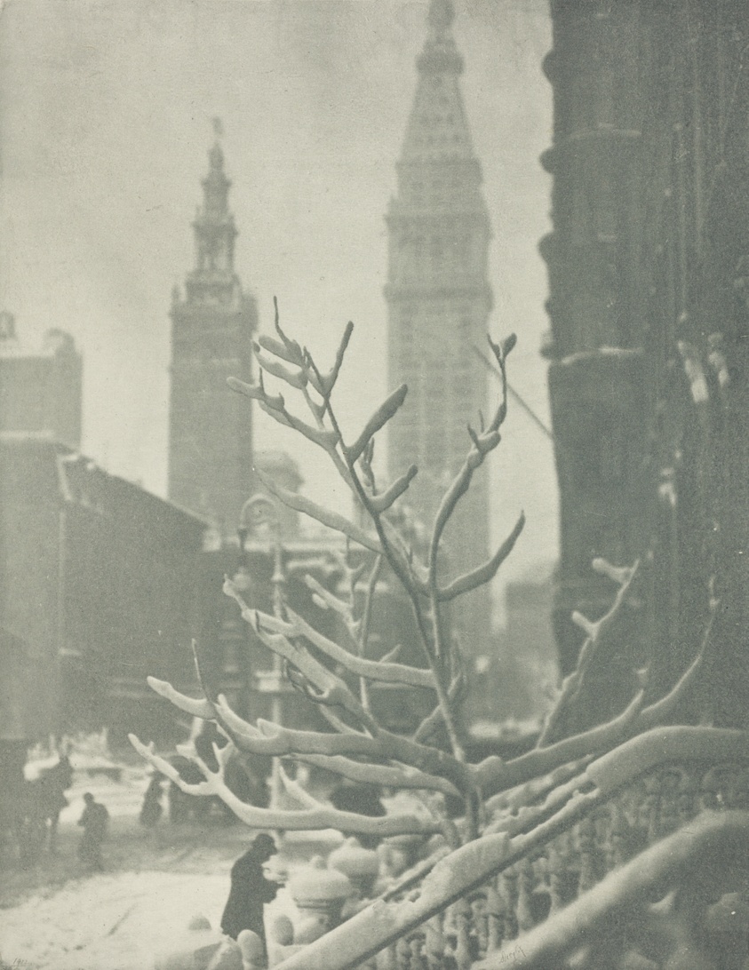 Bold architectural forms pierce through atmospheric haze in this striking urban composition that exemplifies early 20th-century modernist photography.