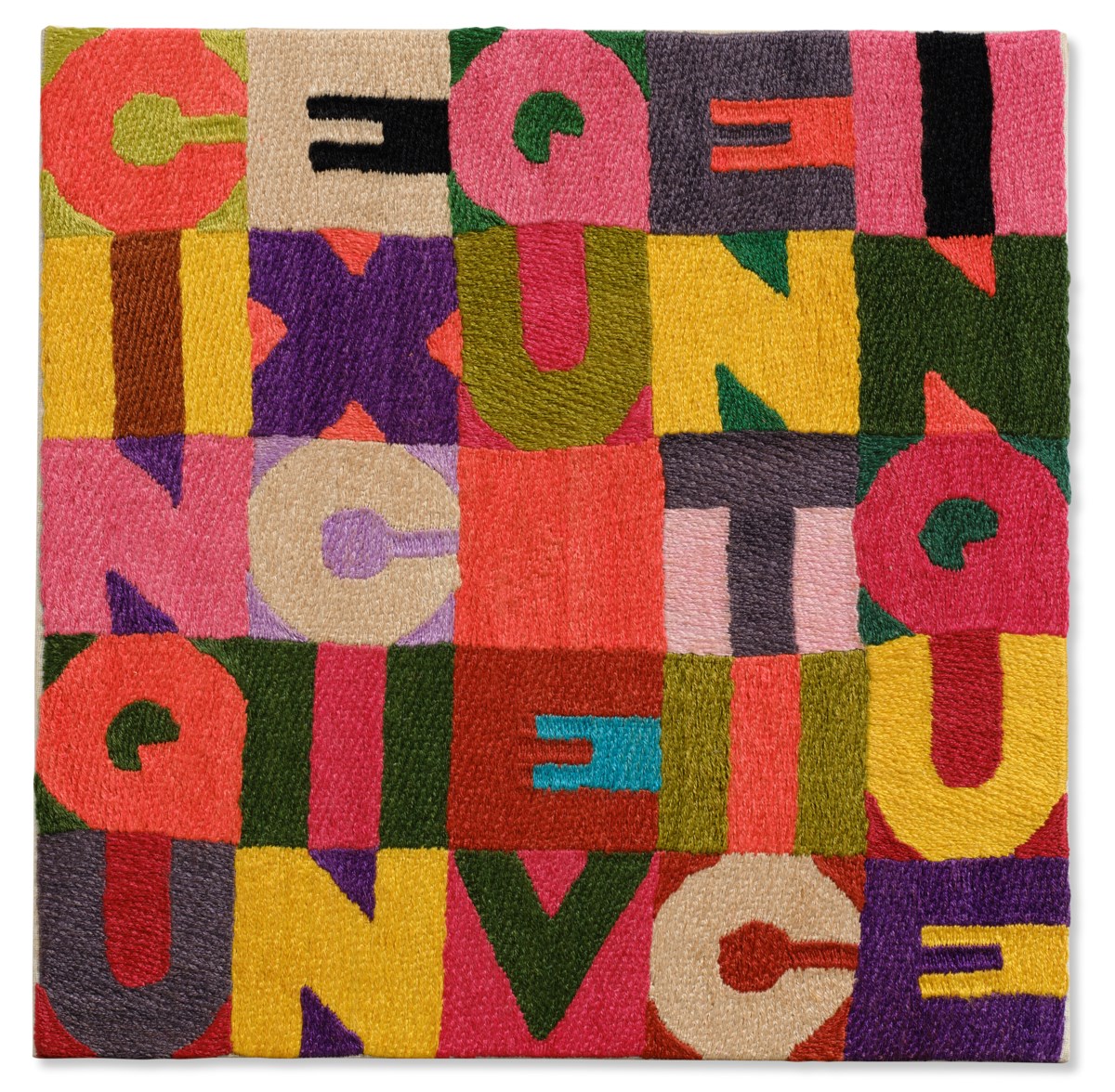 A vibrant grid of embroidered squares fills the composition, each cell bursting with intricate geometric patterns and bold colors arranged in a precise five-by-five formation. Boetti's characteristic use of Afghan craftswomen's needlework transforms the mathematical simplicity of multiplication into a richly tactile and visually complex textile work. The piece reflects his enduring fascination with order and chance, systems of knowledge, and the collaborative blurring of authorship between artist and maker.