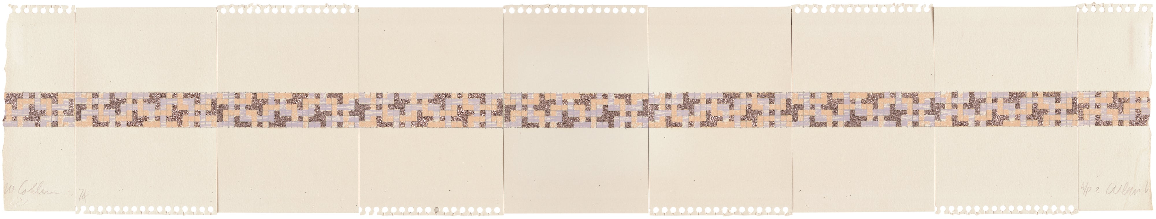 Allan McCollum's *Untitled* is a unique screenprint executed in colors with glitter across eight sheets of Arches paper, each backed by Roll Rives paper as originally issued. The work reflects McCollum's longstanding investigation into mass production, seriality, and the nature of uniqueness, as the multi-sheet format and shimmering glitter surface simultaneously suggest both multiplicity and singular distinction. The use of high-quality printmaking materials underscores the tension between fine art tradition and McCollum's conceptual questioning of originality and value.