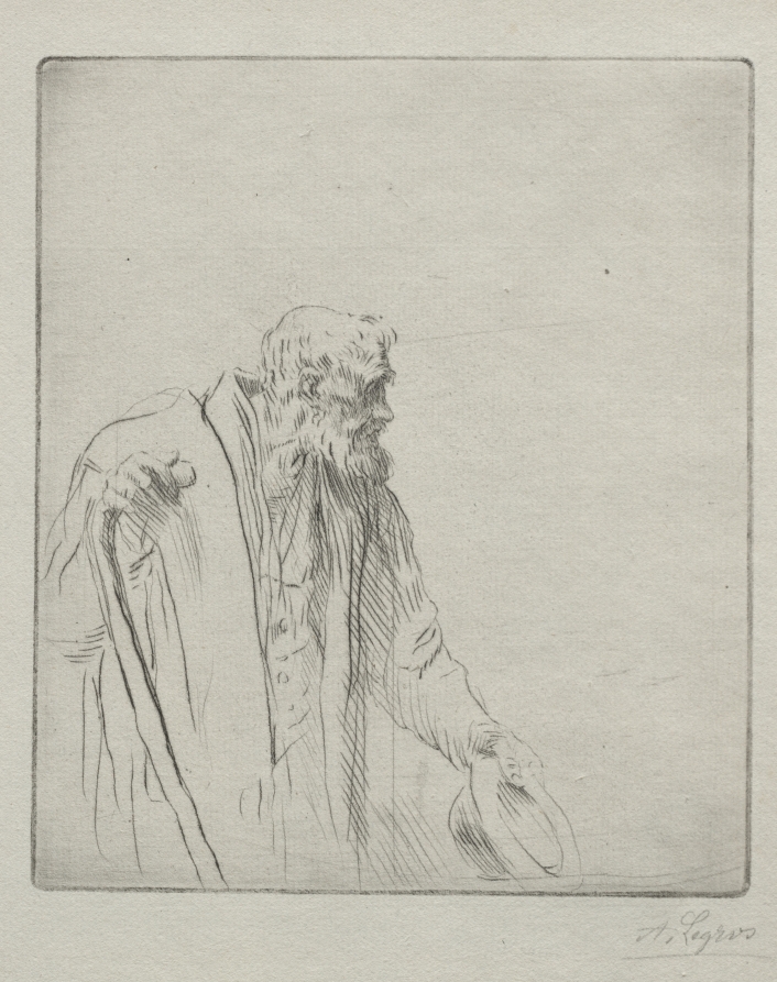 Executed in pure drypoint, the portrait demonstrates Legros's compassionate social observation and his mastery of the technique's characteristic rich, velvety lines.