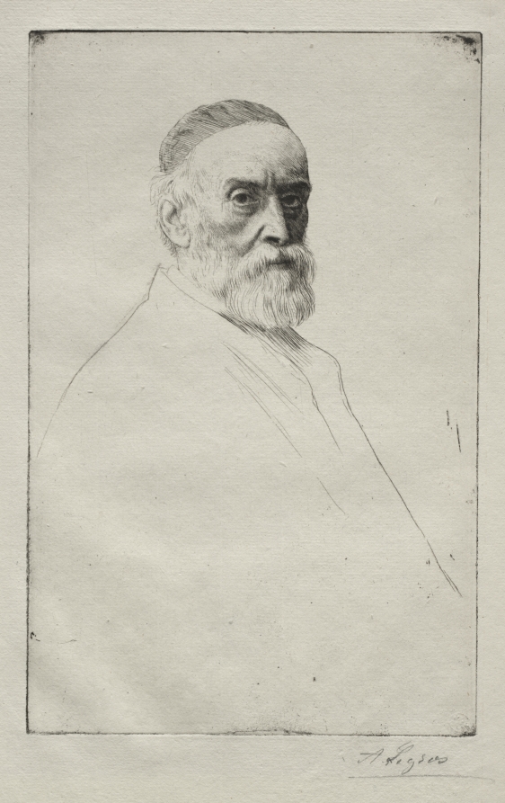 A masterful portrait of the renowned Pre-Raphaelite painter, demonstrating Legros's ability to capture both physical likeness and artistic temperament through drypoint technique.