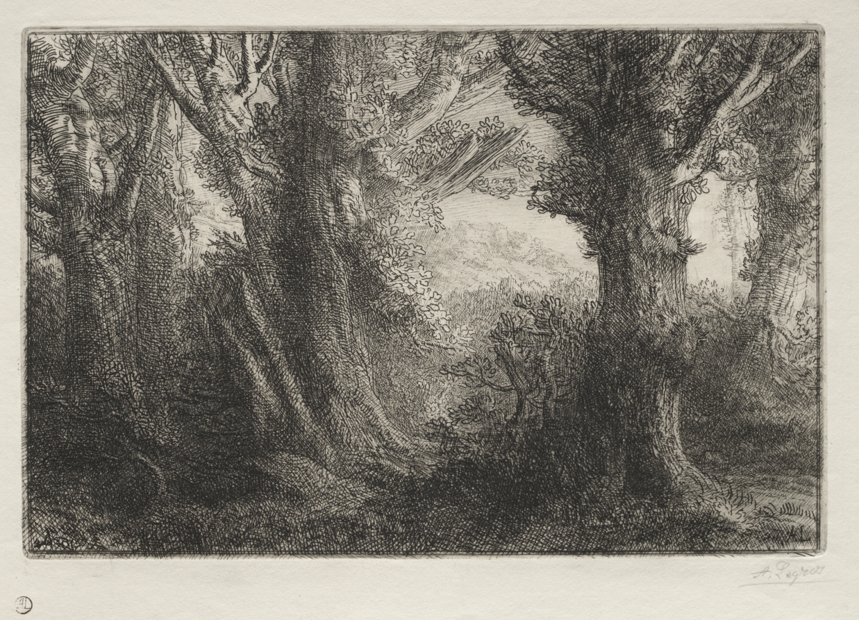 Forest depths emerge through intricate etched lines that create a sense of mystery and natural solitude typical of Barbizon School influence.