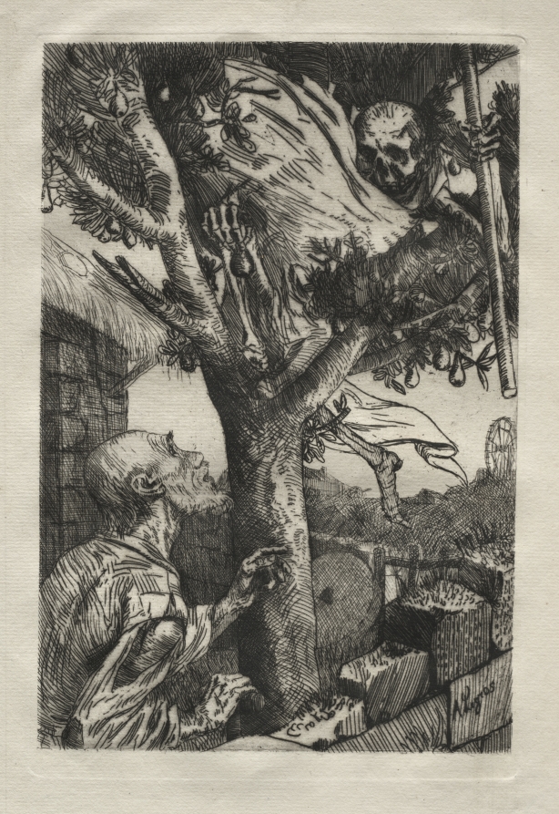 Created during Legros's mature period, the work demonstrates his darkening vision and technical sophistication in combining symbolic content with masterful etching technique.