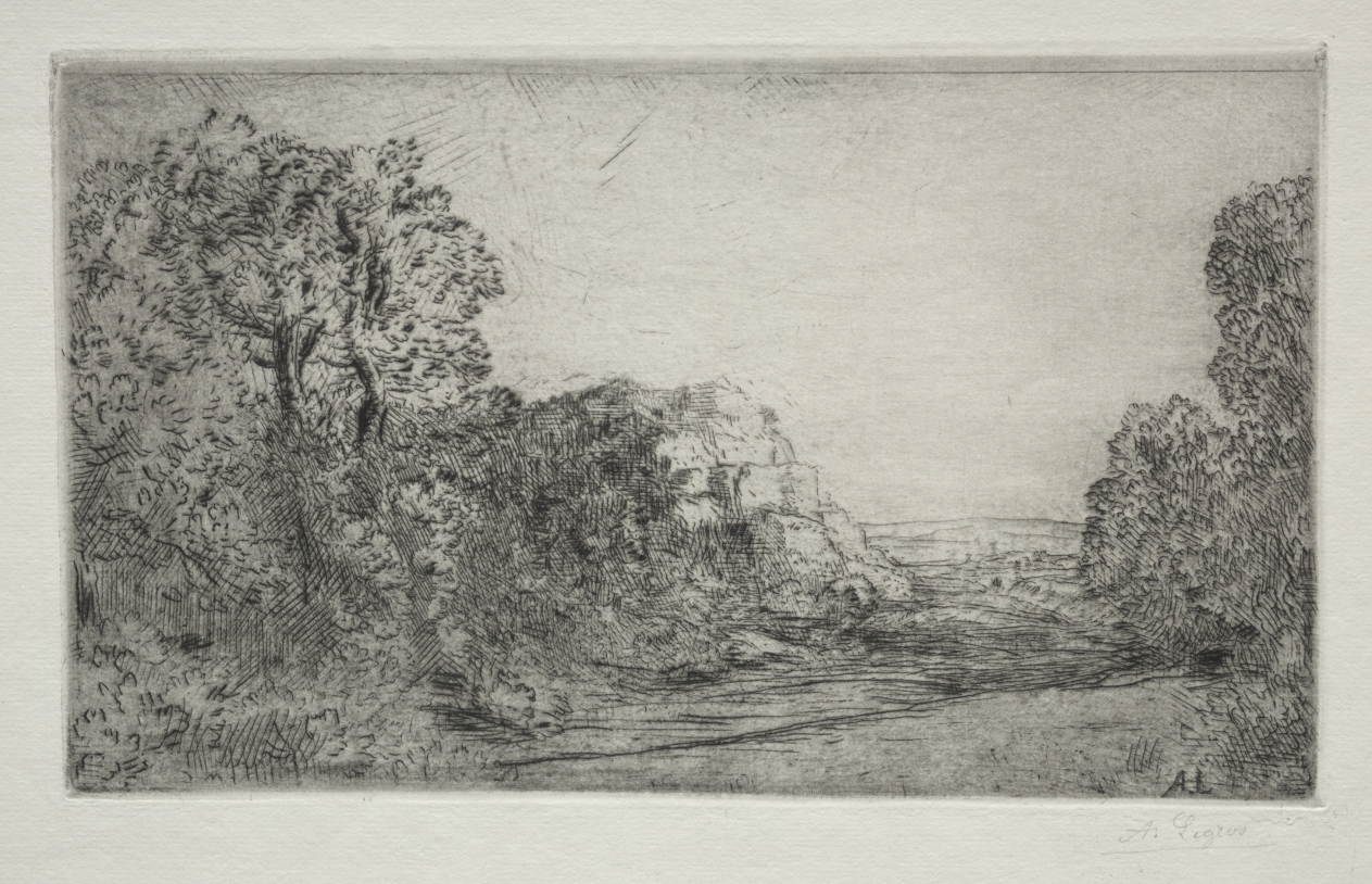Delicate drypoint lines capture the ephemeral quality of dawn breaking over a serene countryside, demonstrating Legros' mastery of atmospheric effects in his early printmaking career.