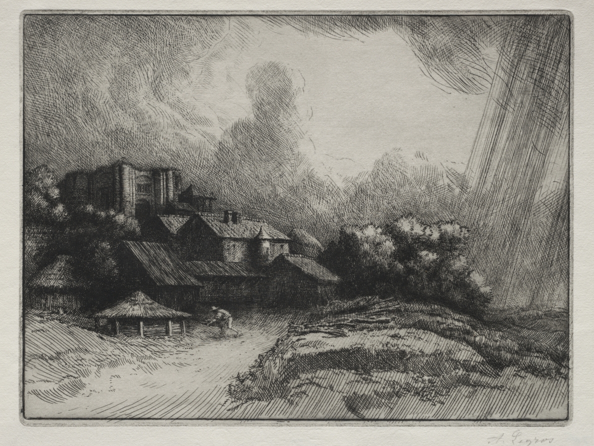 Blending etching and drypoint techniques, the work showcases Legros's skill in depicting rural architecture within carefully composed pastoral settings.