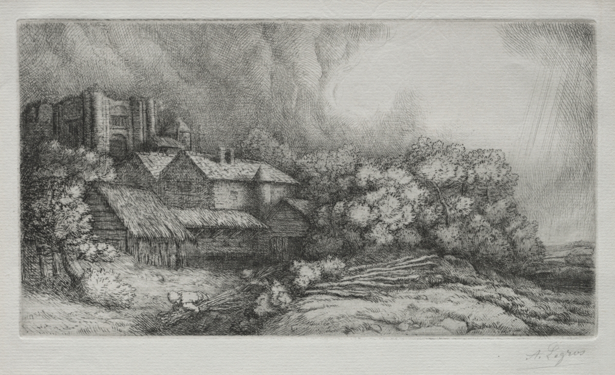 Late career work combines etching and drypoint to achieve rich textural effects in this atmospheric depiction of monastic agricultural life.