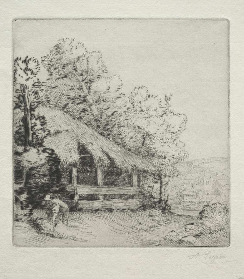 Shows the artist's attention to humble rural architecture, employing drypoint's tonal richness to transform a simple farm building into a study of light and shadow.