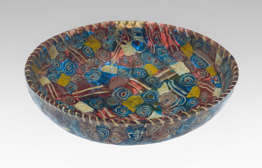 This luminous bowl was made using the laborious and time-consuming composition-cast mosaic glass technique. The particular combination of colors and patterns suggests that this lovely dish was created in the Eastern Mediterranean, a region that grew wealthy from trade with Asian cultures. The town homes and country houses of the local elite boasted beautifully frescoed walls, colorful mosaic floors, and lush, private gardens embellished with decorative sculptures for the sumptuous alfresco banquets that were a favorite evening pastime. This delicate mosaic glass dish was likely made to adorn a splendidly set dinner table alongside other exquisitely wrought platters, bowls, and goblets.