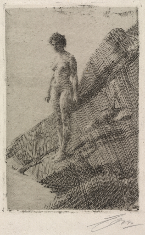 Part of Zorn's later exploration of Swedish rural life, this etching employs bold contrasts between light and shadow to create a compelling character study.