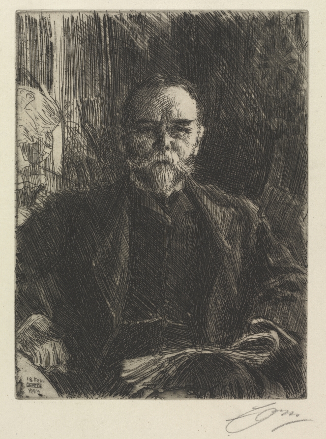 Depicting the American statesman and Secretary of State, this formal portrait demonstrates Zorn's skill at capturing both physical likeness and psychological presence in his etchings.