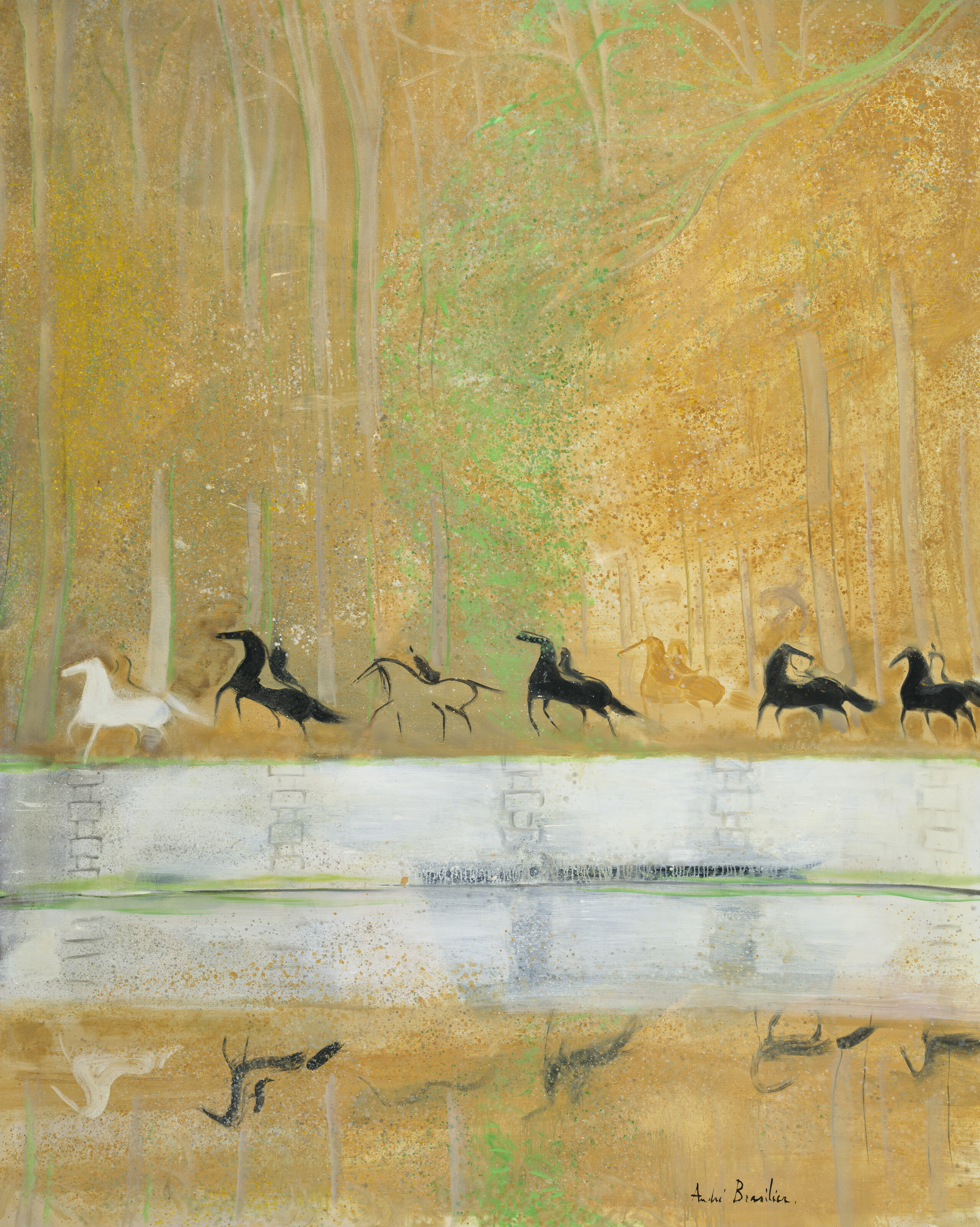 "Cavalcade d'automne" by André Brasilier captures a dynamic procession of horses and riders moving through a landscape suffused with warm autumnal tones. The composition demonstrates Brasilier's characteristic style, which blends figurative representation with expressive brushwork and a rich, earthy color palette of golds, ochres, and deep browns. The work conveys movement and energy while celebrating the natural beauty of the autumn season through the artist's gestural, painterly approach.