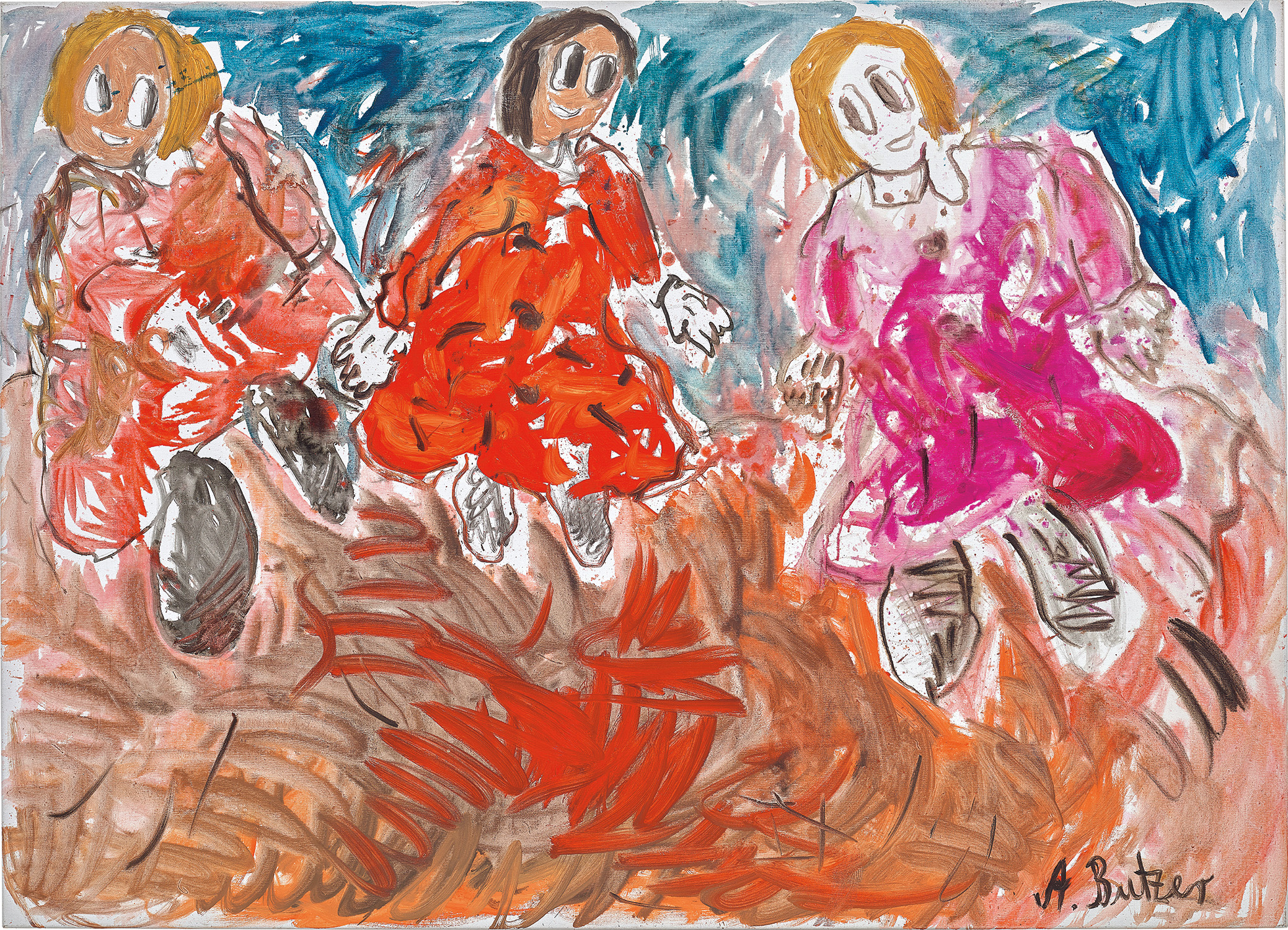 A large-scale, frenetic canvas by André Butzer bursts with his signature blend of expressionist energy and cartoonish figuration, combining garish, clashing colors with raw, gestural brushwork. The work merges references to American pop culture and German history into a haunting yet darkly absurd visual language, evoking both childhood innocence and existential unease. Butzer's characteristically crude, mask-like figures emerge from a chaotic surface that oscillates between playful naivety and unsettling psychological depth.