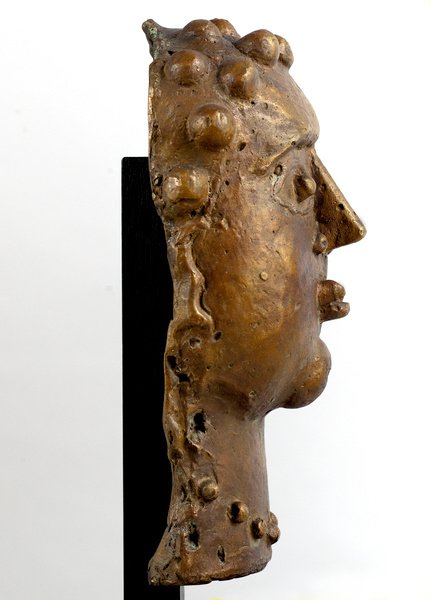 Elegant bronze portrait captures feminine grace through the interplay of smooth surfaces and the linear detail of a single strand of pearls.