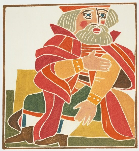 Rabelaisian character comes to life through bold woodcarving techniques that emphasize the grotesque and comedic aspects of the literary figure.