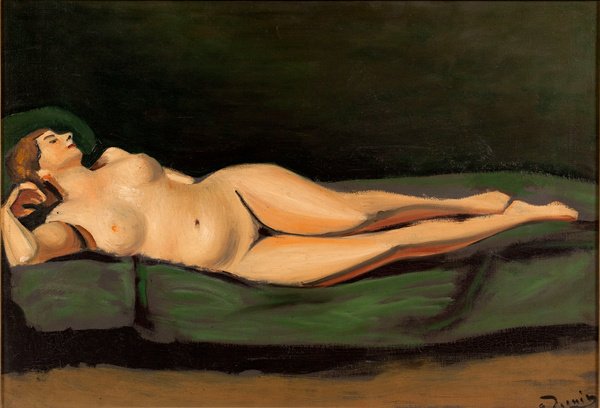 Vibrant color contrasts between the nude figure and green upholstery showcase Derain's continued interest in bold chromatic relationships even after his Fauve period.
