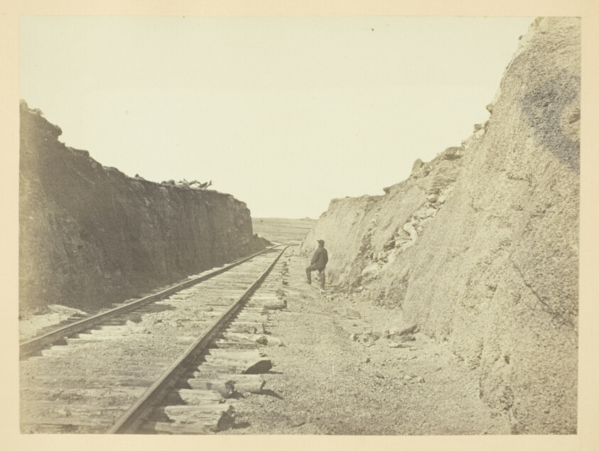 Documenting the extensive excavation required for railroad passage through the Laramie Range, Russell's image serves as both engineering record and artistic statement about human transformation of the Western landscape.