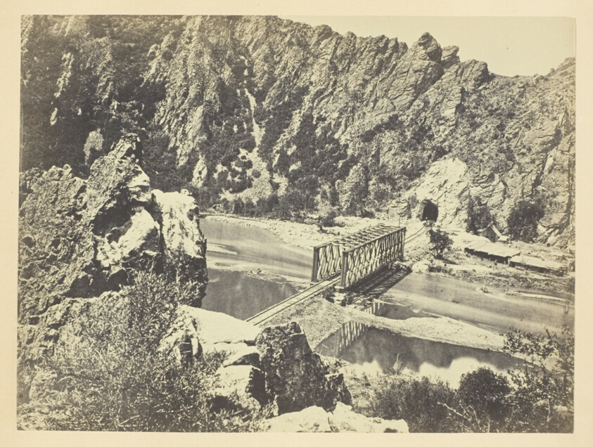 Among Russell's most technically significant railroad photographs, the image documents the engineering challenges of Western expansion while showcasing the photographer's ability to work in difficult mountain terrain.