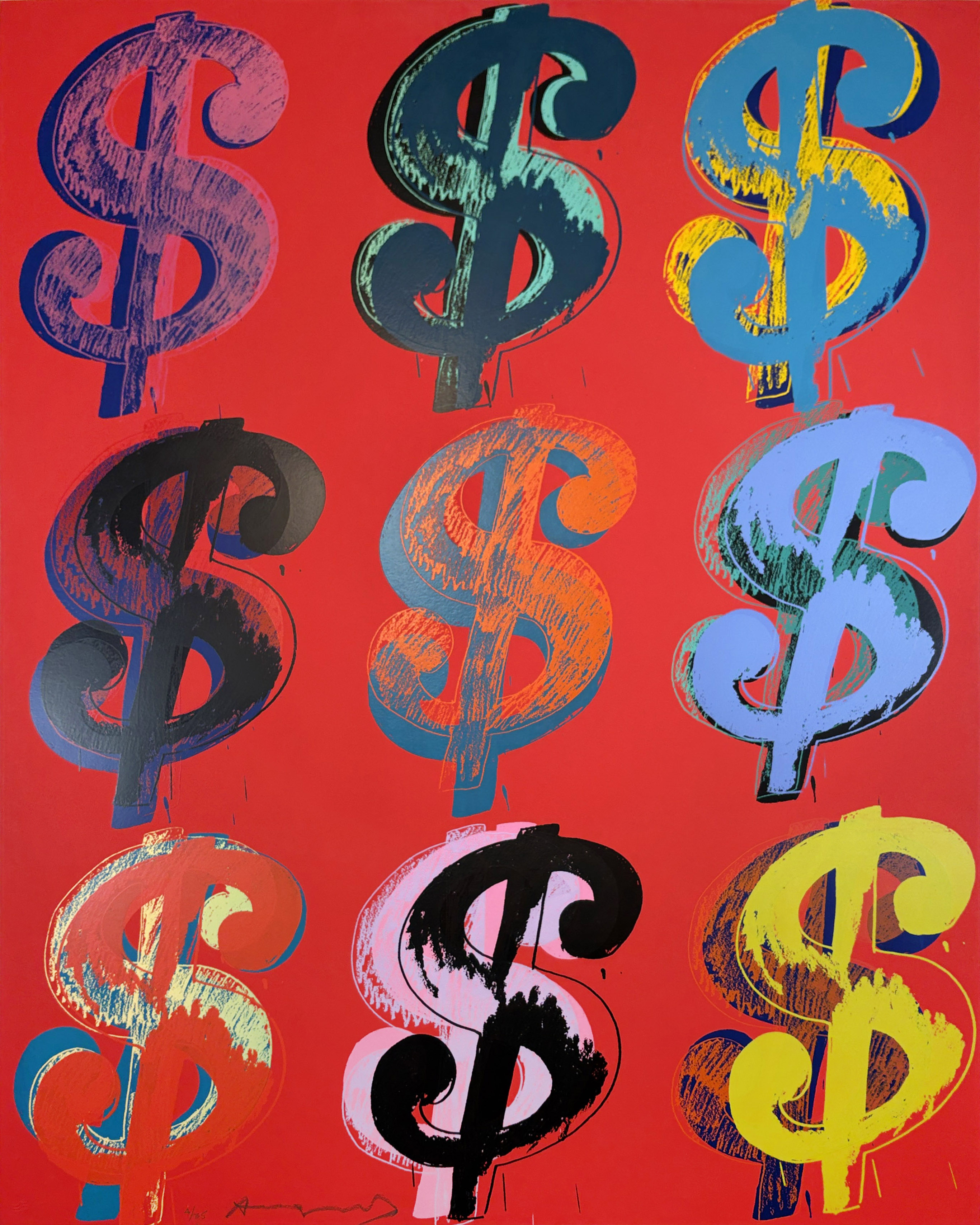 This 1982 screenprint exemplifies Warhol's fascination with American capitalism and consumer culture through his iconic repetition of the dollar sign motif. Part of a limited edition of 35, the work demonstrates his signature commercial printing technique applied to Lenox Museum Board, transforming the universal symbol of money into high art commentary.
