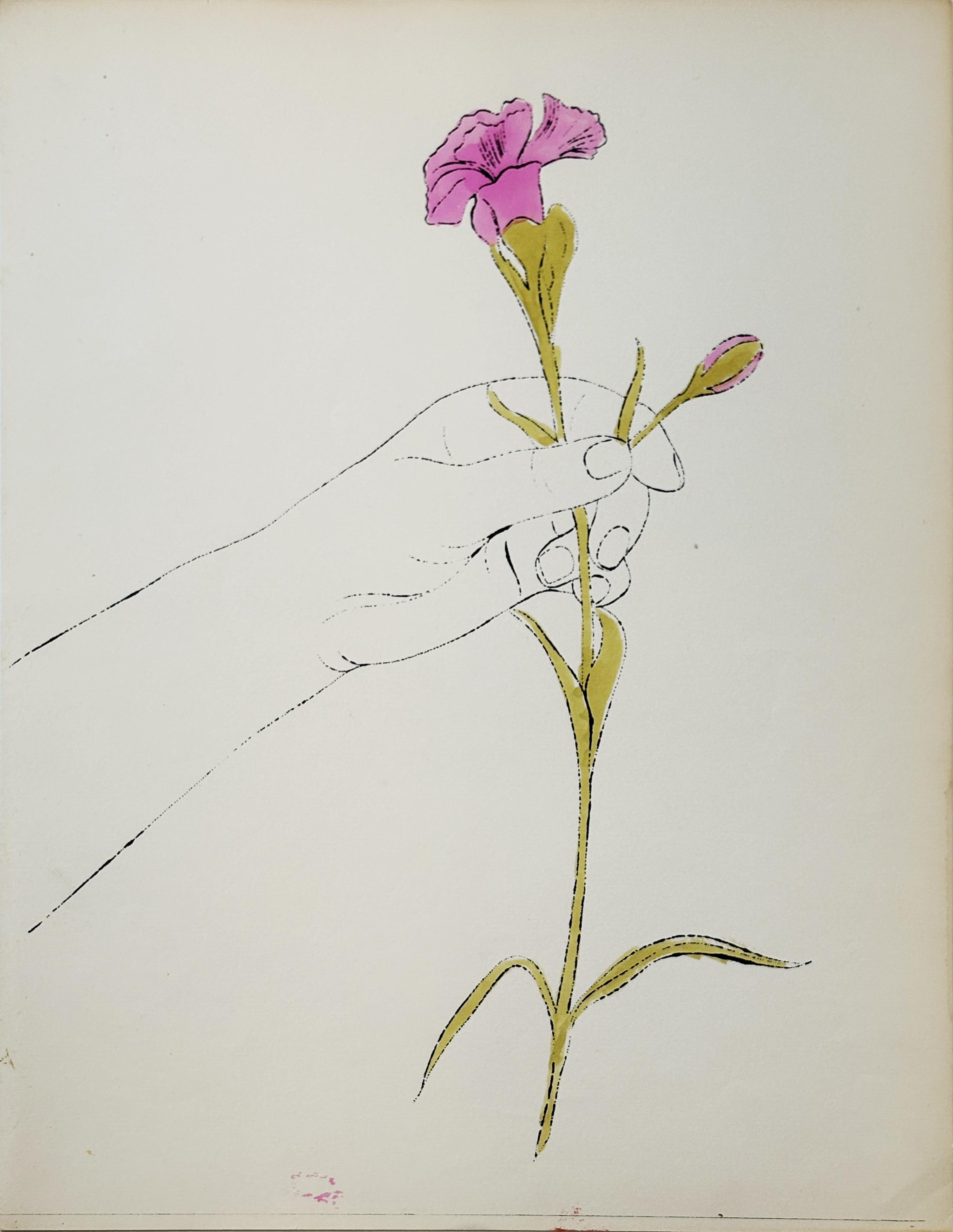 This early offset lithograph with watercolor demonstrates Warhol's experimentation with commercial printing techniques before his famous silkscreen works, featuring his characteristic hand-colored elements. Created during his transition from commercial illustration to fine art, the piece exemplifies his pioneering fusion of mass-production methods with traditional artistic media.