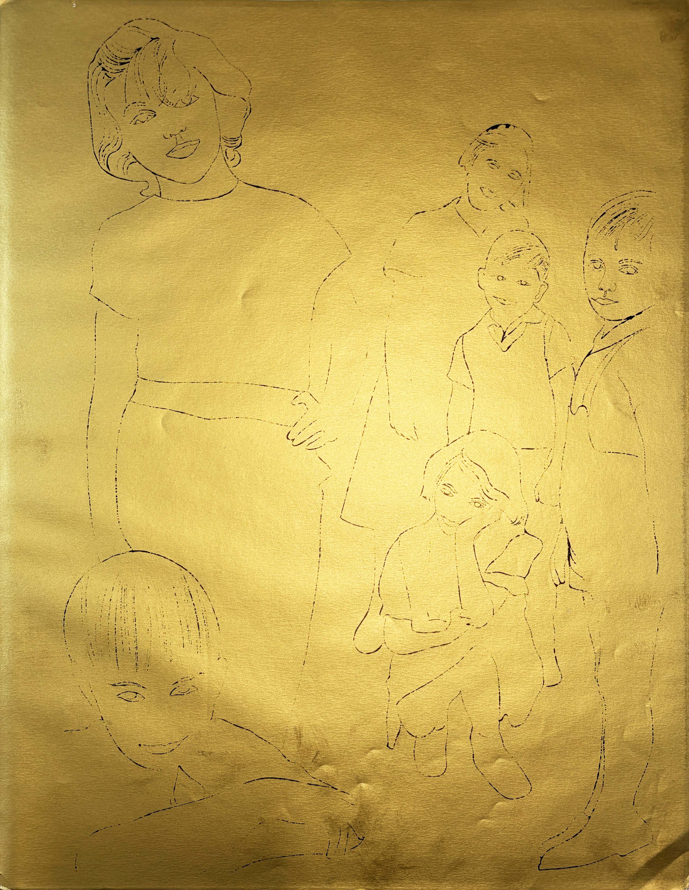 This early offset lithograph on gold paper represents Warhol's commercial art period before his famous Pop Art works, demonstrating his innovative use of metallic surfaces and mass-production printing techniques that would later define his artistic practice. The work showcases Warhol's prescient exploration of commercialized art-making processes during his transition from advertising illustrator to fine artist.