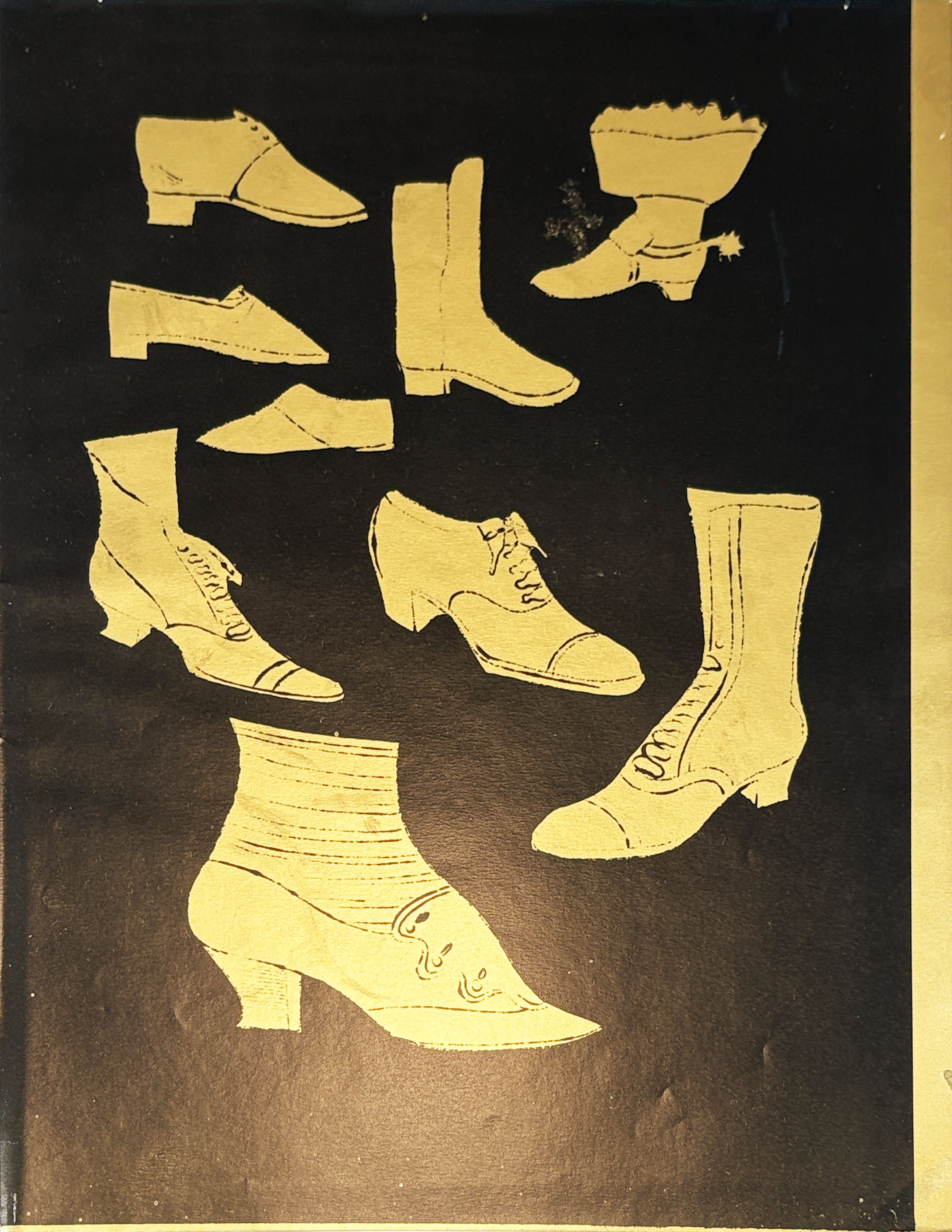 This early offset lithograph on gold paper represents Warhol's commercial art period before his famous Pop Art works, demonstrating his innovative use of metallic surfaces and mass-production printing techniques that would later define his artistic practice. The work showcases Warhol's prescient exploration of reproducibility and commercial aesthetics that anticipated his groundbreaking silkscreen paintings of the 1960s.