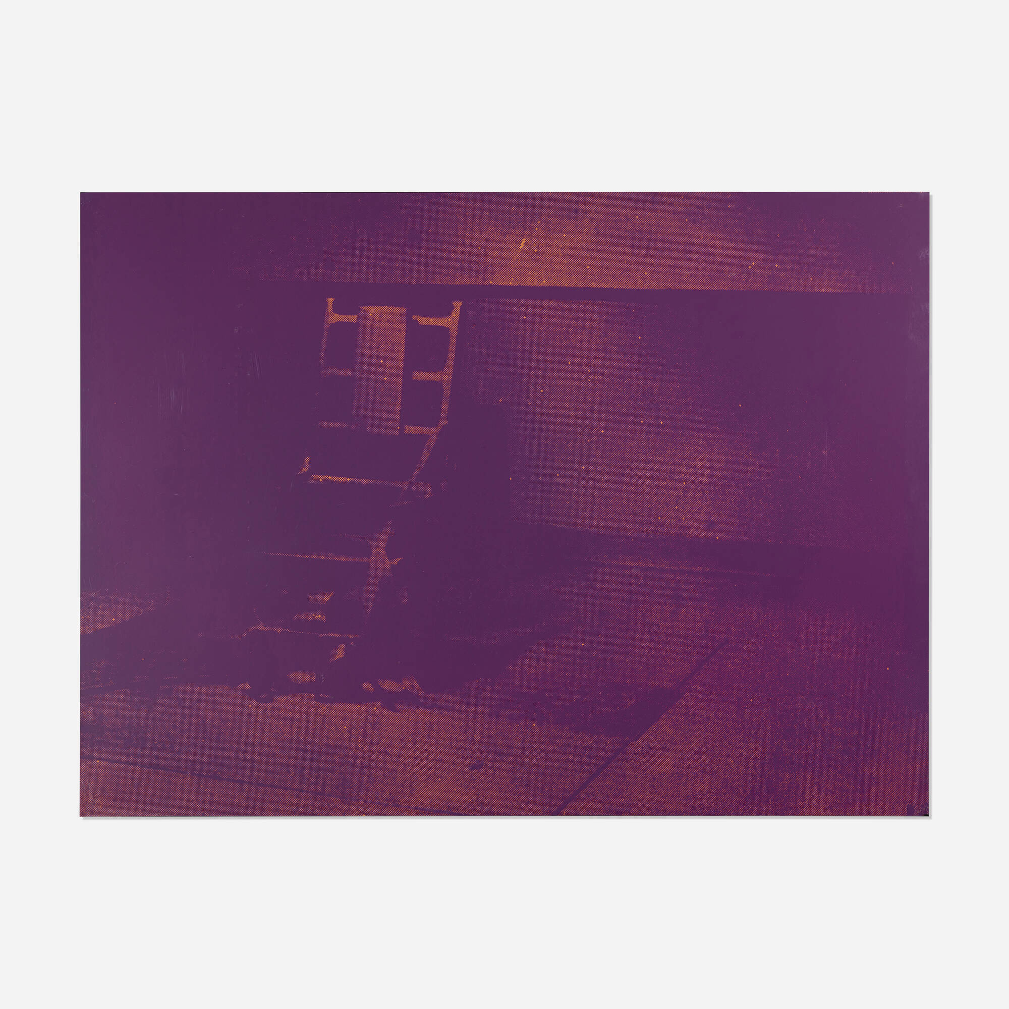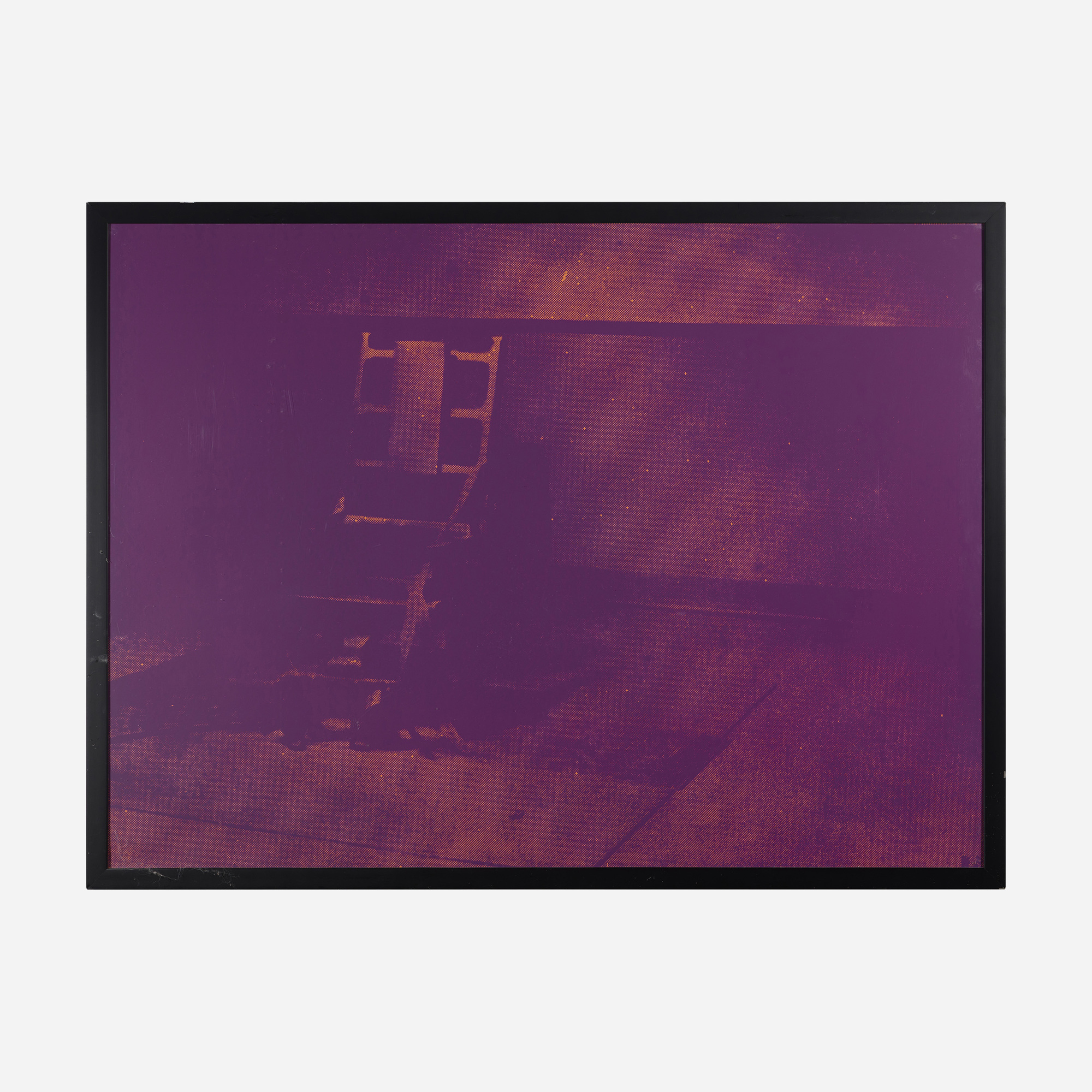 Andy Warhol's 1971 screenprint depicts the infamous electric chair in his characteristic deadpan style. The work employs repetition and bold color blocking to transform a symbol of death into a pop art icon. The composition shows the empty chair in a stark institutional setting rendered in vivid hues. This piece reflects Warhol's fascination with death, danger, and American obsessions presented through his silkscreen technique.