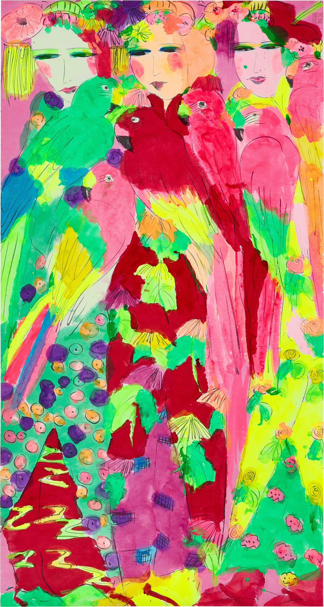 Ting produced vibrant small to medium format paintings of flowers and nature rendered in high contrast bold colors with flattened graphic forms, sharing the same Factory era Pop sensibility and decorative intensity found in this specific Warhol hibiscus composition.