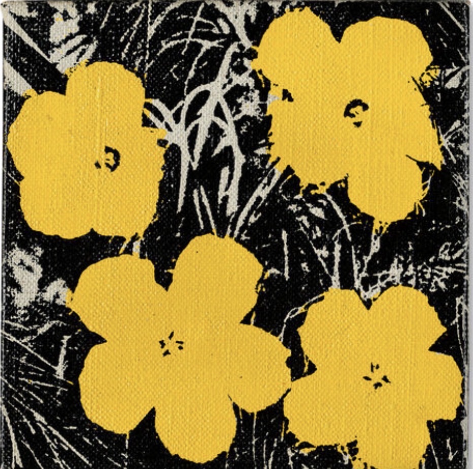 A quintessential example of Warhol's celebrated Flowers series, this intimate 5×5 inch canvas presents four bold yellow hibiscus-like blooms against a high-contrast black-and-white photographic foliage ground. The silkscreen technique flattens the organic forms into graphic, near-abstract shapes, embodying Warhol's signature Pop transformation of nature into commodity. As a unique work hand-signed by the artist, it carries the full weight of Warhol's Factory-era output in a remarkably collectible small format. A Certificate of Authenticity issued by the gallery accompanies the work.