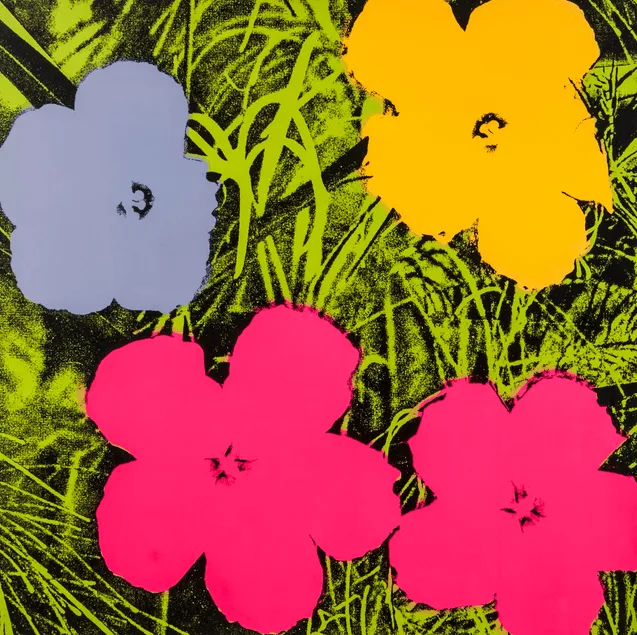A screen print from Warhol's iconic Flowers series, featuring vibrant colors and repetitive floral imagery. This work exemplifies his appropriation of photography and exploration of natural beauty through commercial printing techniques.