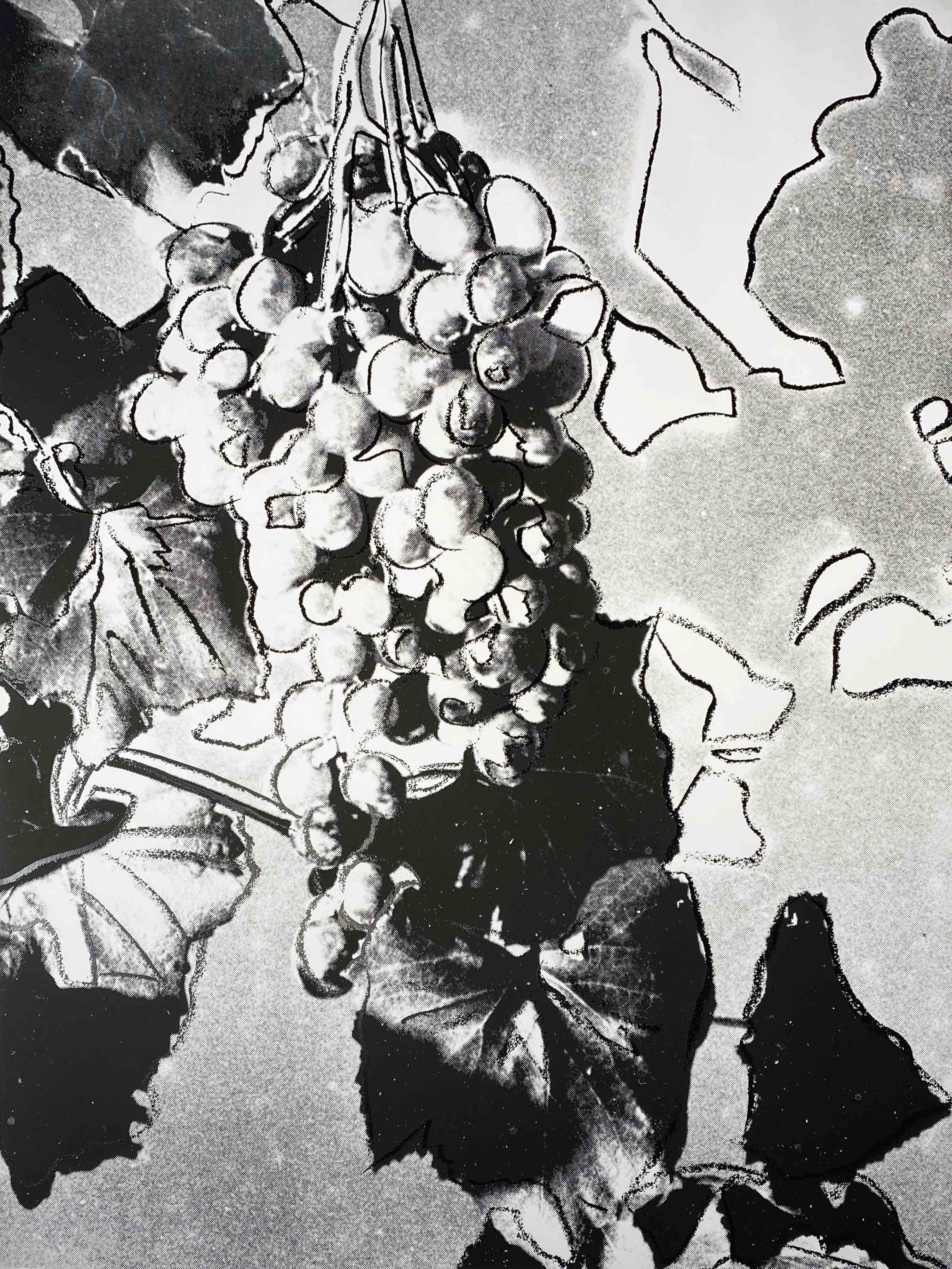 This unique black and white screenprint represents Warhol's exploration of traditional still life subjects through his signature Pop Art lens, stripping away the vibrant colors typically associated with his commercial work. The monochromatic treatment of the grape cluster demonstrates his continued experimentation with printmaking techniques in his later career.