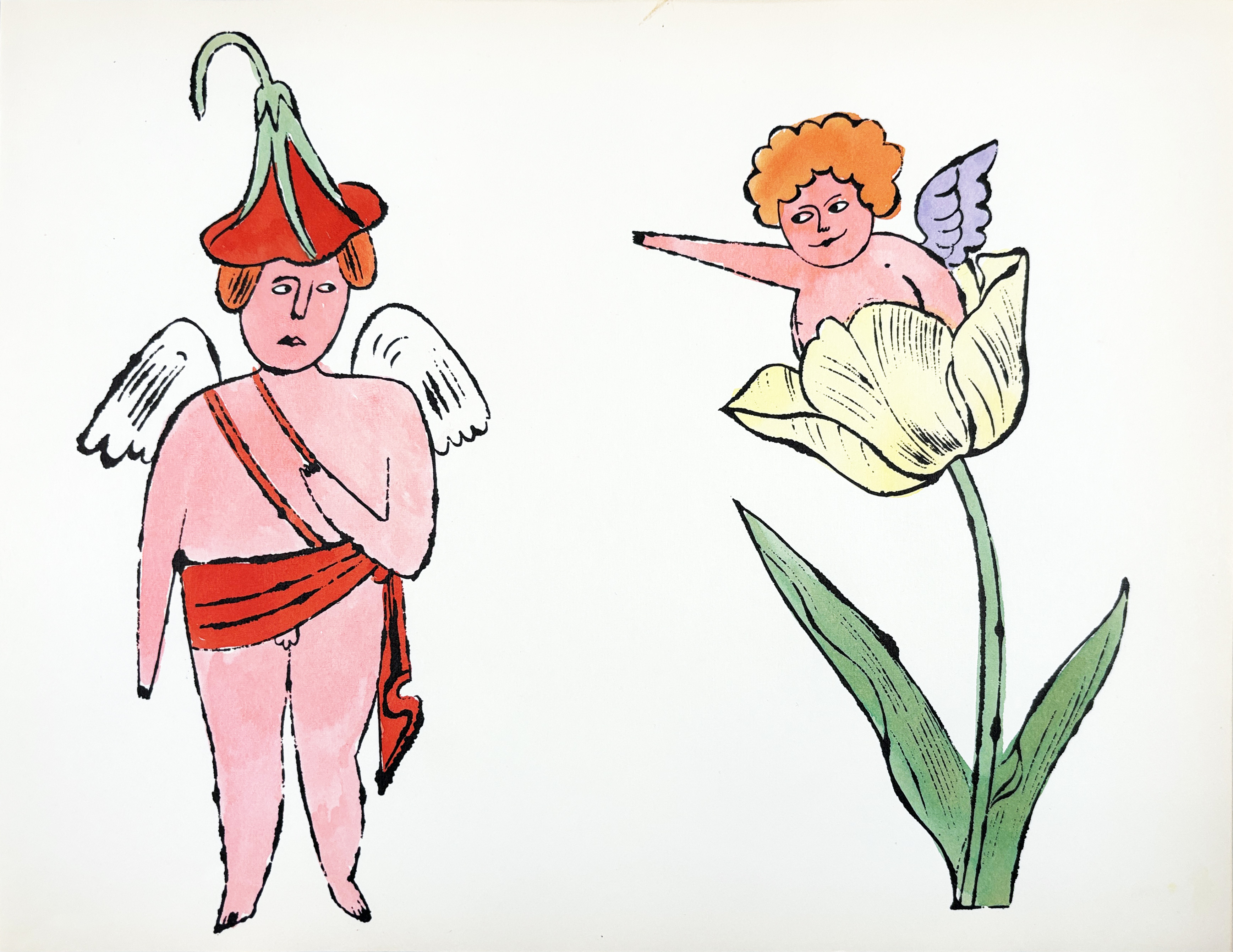 This early lithograph with watercolor demonstrates Warhol's pre-Pop art sensibility, created during his commercial illustration period before his famous silkscreen works. The whimsical garden subject matter and delicate hand-coloring technique reveal the artist's roots in decorative arts and foreshadow his later interest in mechanical reproduction processes.