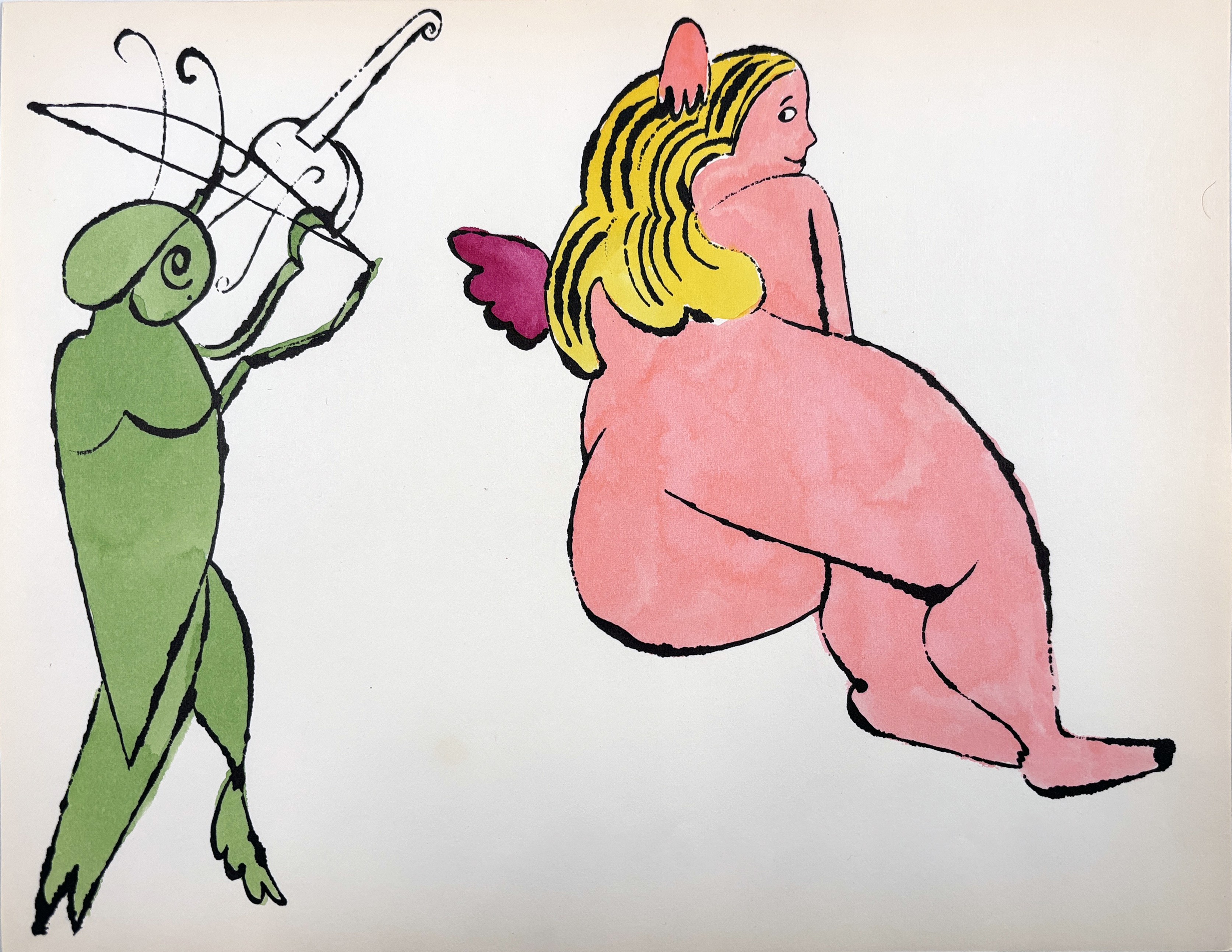 This early lithograph with watercolor represents Warhol's pre-Pop art period, showcasing his commercial illustration background through delicate hand-coloring techniques that would later be abandoned for mechanical reproduction methods. The whimsical garden imagery demonstrates his exploration of personal, intimate subjects before transitioning to the mass-produced cultural icons that defined his mature work.