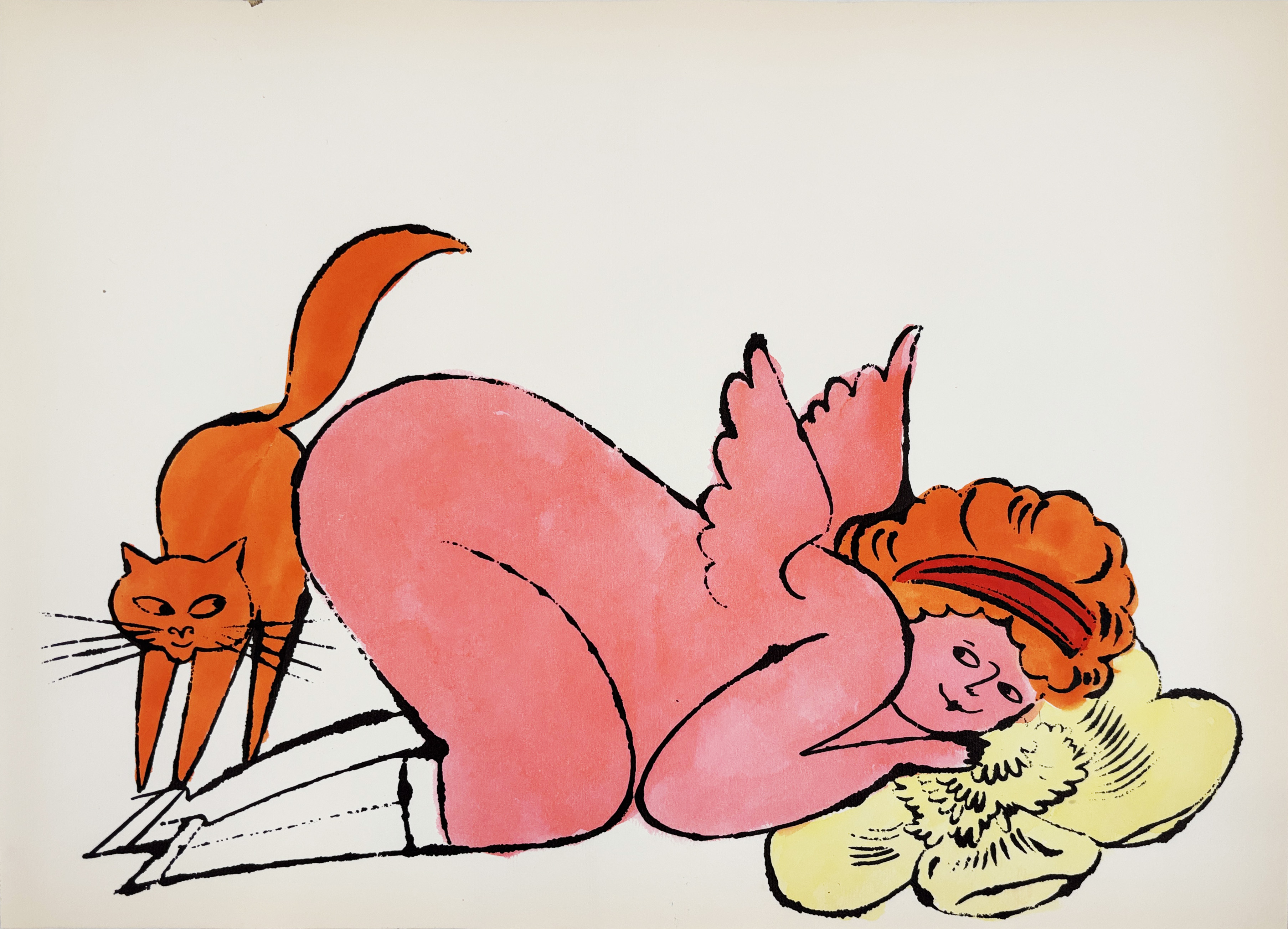 This early lithograph with watercolor demonstrates Warhol's pre-Pop Art commercial illustration style, featuring delicate line work and hand-applied color that predates his iconic silkscreen technique. Created during his successful career as a graphic designer, the whimsical garden subject reflects his illustration work for fashion magazines and department store advertisements.