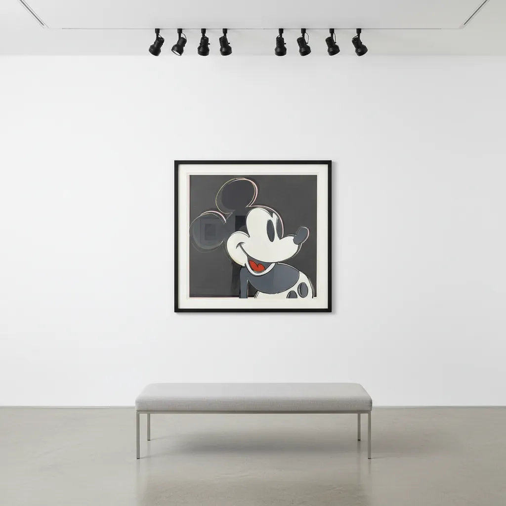 A screen print with diamond dust from Warhol's Myths series, depicting the iconic Mickey Mouse character. This work elevates a beloved mass-culture symbol to fine art status while adding precious embellishment.