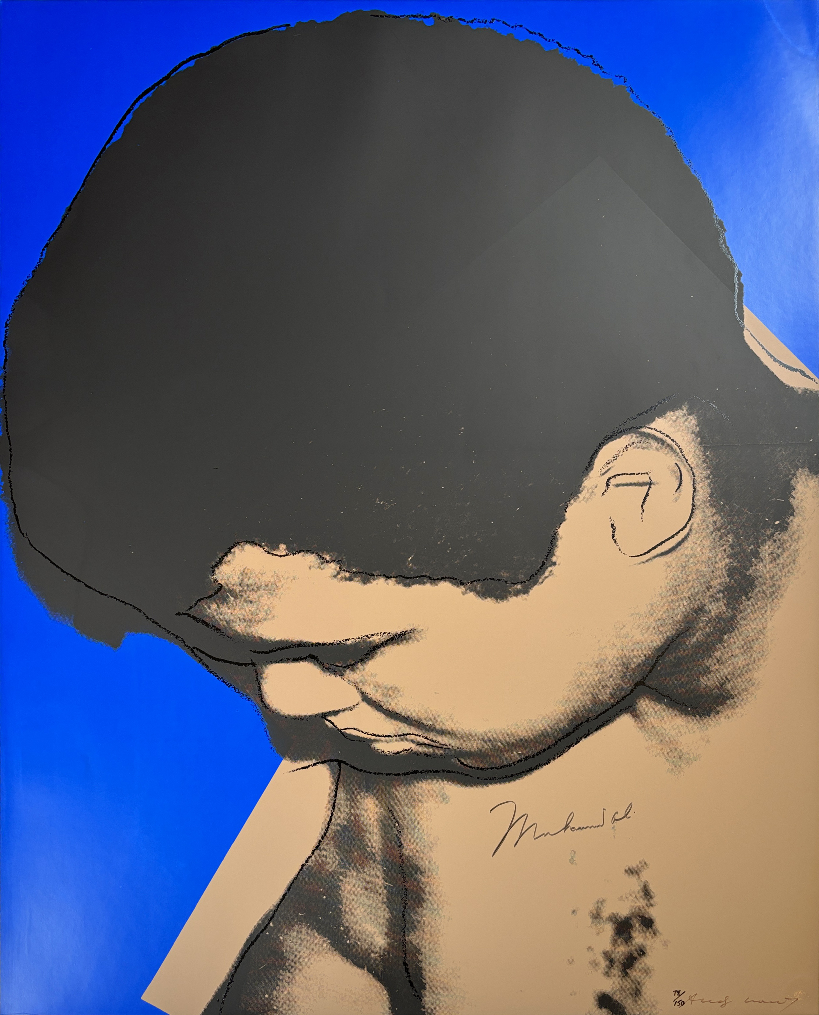 This screenprint captures the legendary boxer Muhammad Ali in a contemplative downward gaze, exemplifying Warhol's fascination with celebrity portraiture and athletic prowess. The work demonstrates Warhol's masterful use of high-contrast screenprinting techniques on quality Bristol paper to create a striking, intimate portrait of one of the 20th century's most iconic figures.
