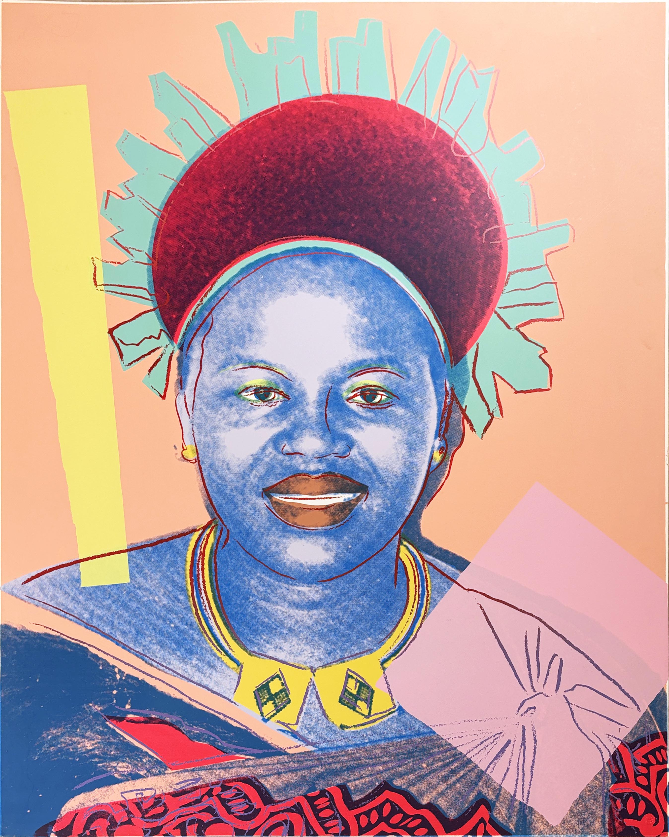 Part of Warhol's celebrated 1985 "Reigning Queens" series, this unique screenprint depicts Queen Ntombi Twala of Swaziland in the artist's signature pop art style, combining bold colors with photographic source material. The work exemplifies Warhol's fascination with power, celebrity, and global iconography while showcasing his mastery of the screenprinting medium through distinctive color variations.