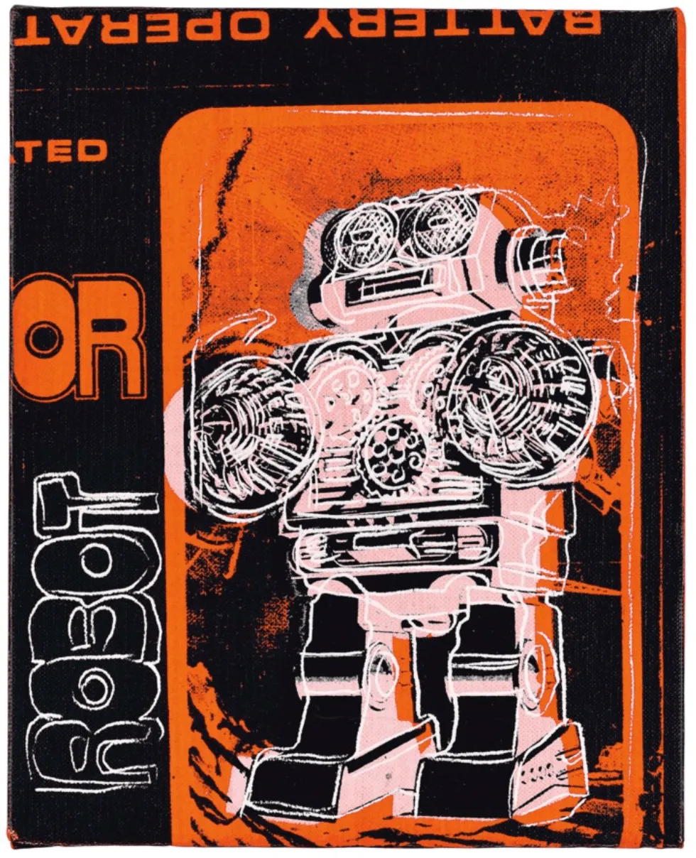 A vibrant work combining acrylic and silkscreen techniques to depict a robot character from toy paintings. This piece reflects Warhol's interest in mass-produced imagery and childhood nostalgia.