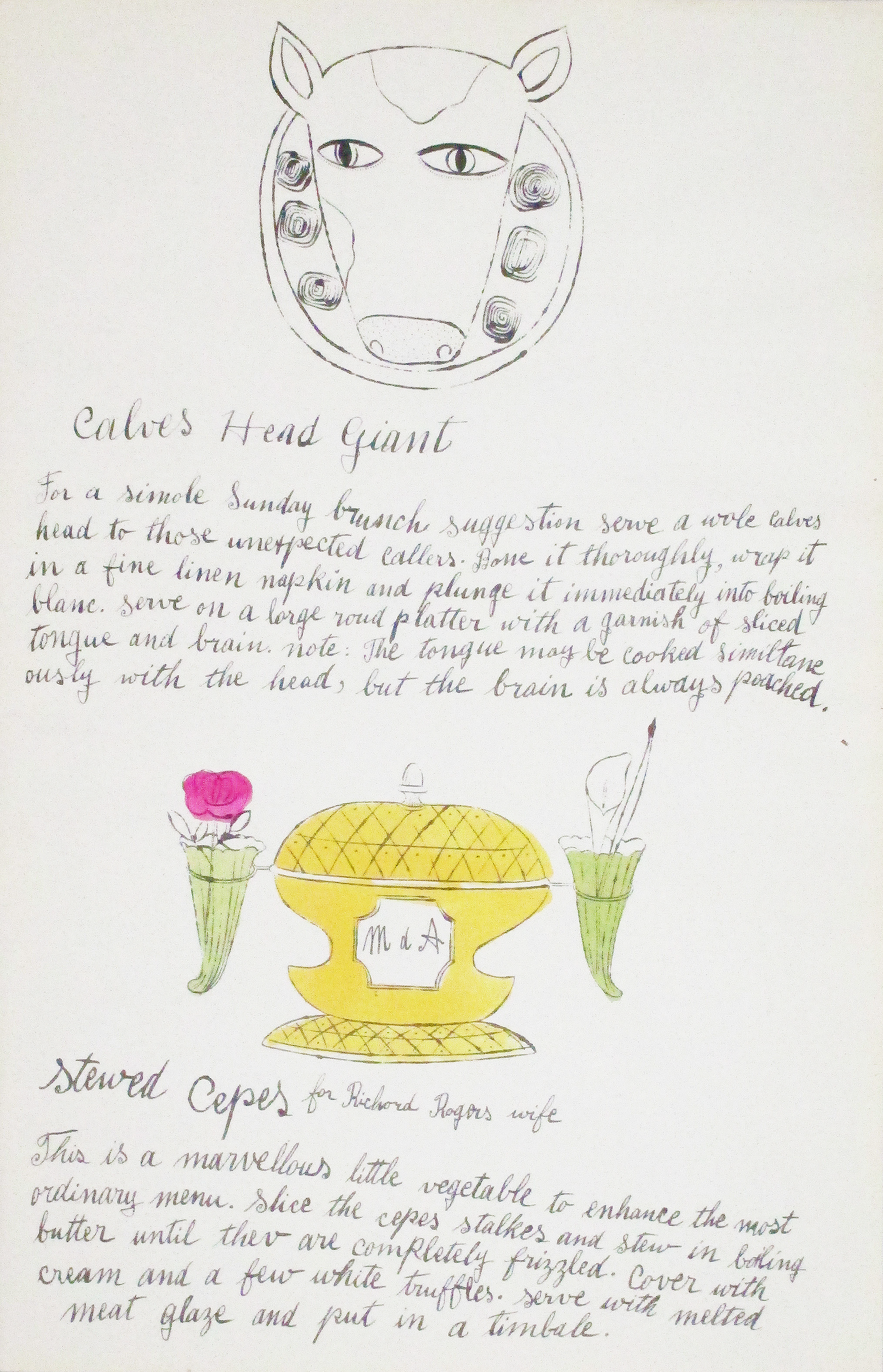 This early offset lithograph with watercolor demonstrates Warhol's commercial art background before his transition to fine art, featuring hand-applied watercolor over mechanically printed elements. Part of a cookbook collaboration with socialite Suzy Frankfurt, the work presages his later fascination with consumer culture and hybrid printing techniques.