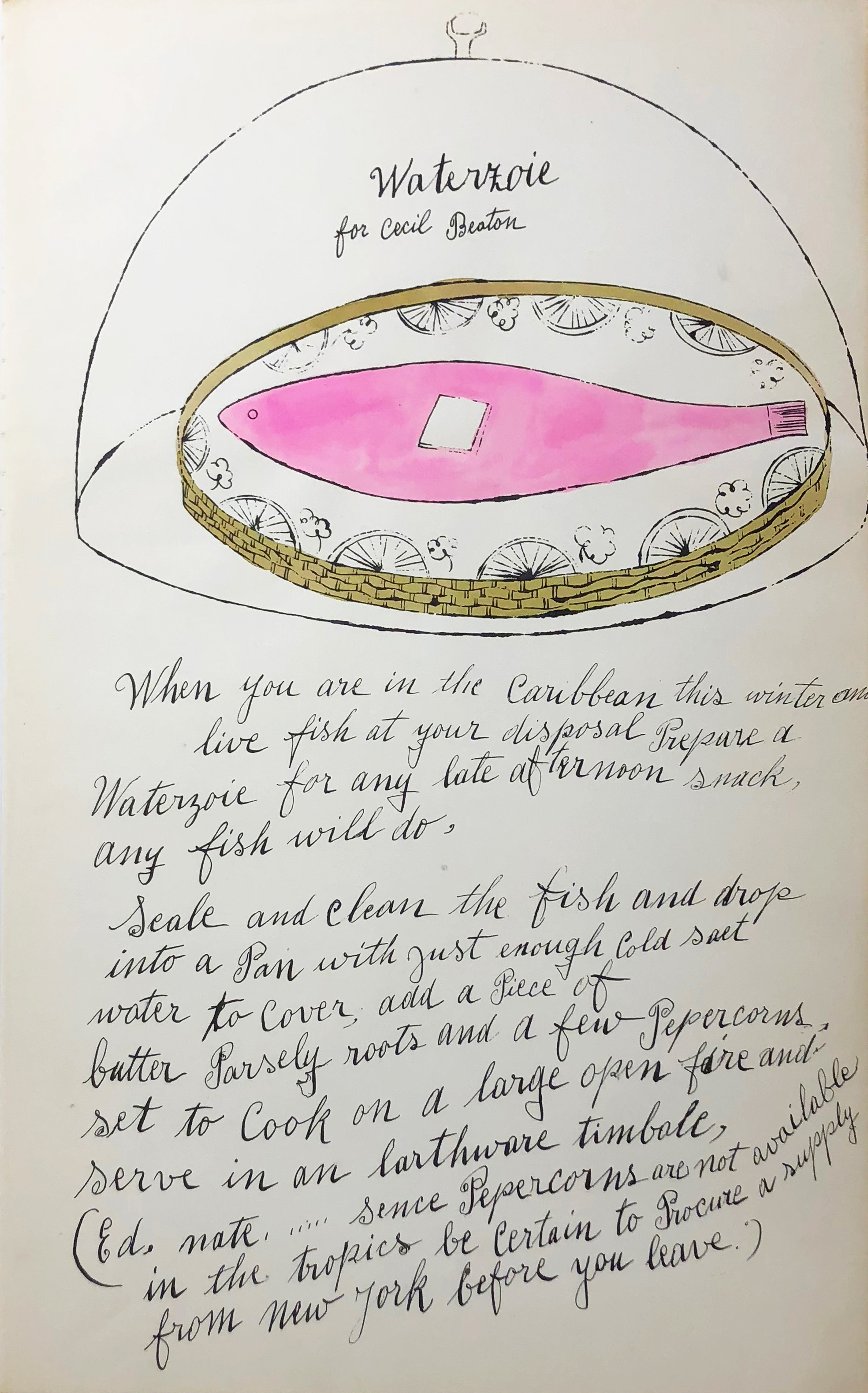 This early offset lithograph and watercolor demonstrates Warhol's commercial illustration background before his iconic Pop Art period, featuring hand-applied watercolor details that contrast with his later mechanized printmaking techniques. Part of a cookbook collaboration, the work bridges his commercial design career and fine art practice through its blend of industrial printing methods and traditional painting.