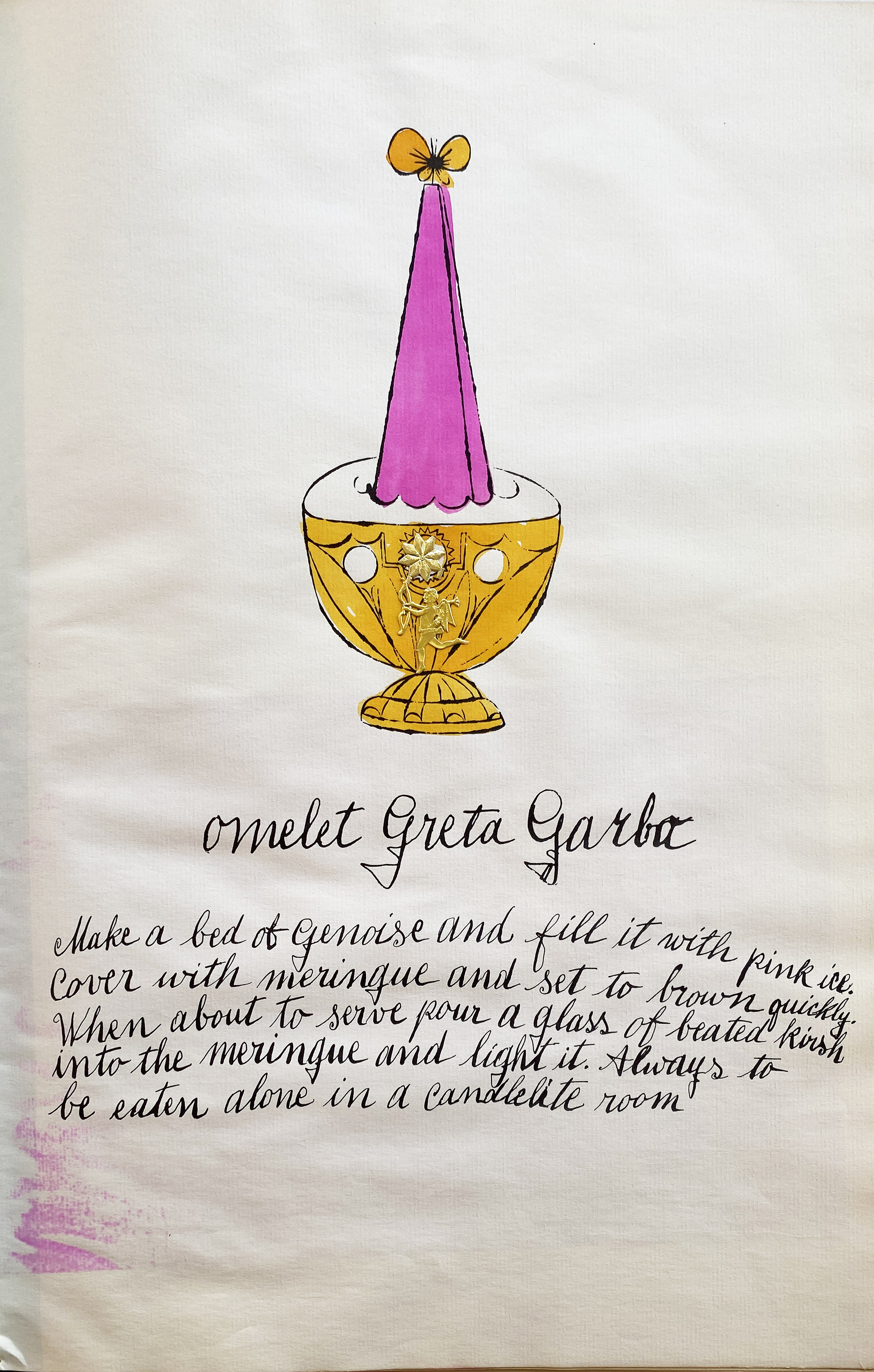 This early offset lithograph with watercolor demonstrates Warhol's commercial illustration background before his transition to Pop Art, featuring hand-applied watercolor over mechanically reproduced elements that would later define his artistic practice of combining commercial printing techniques with fine art media.