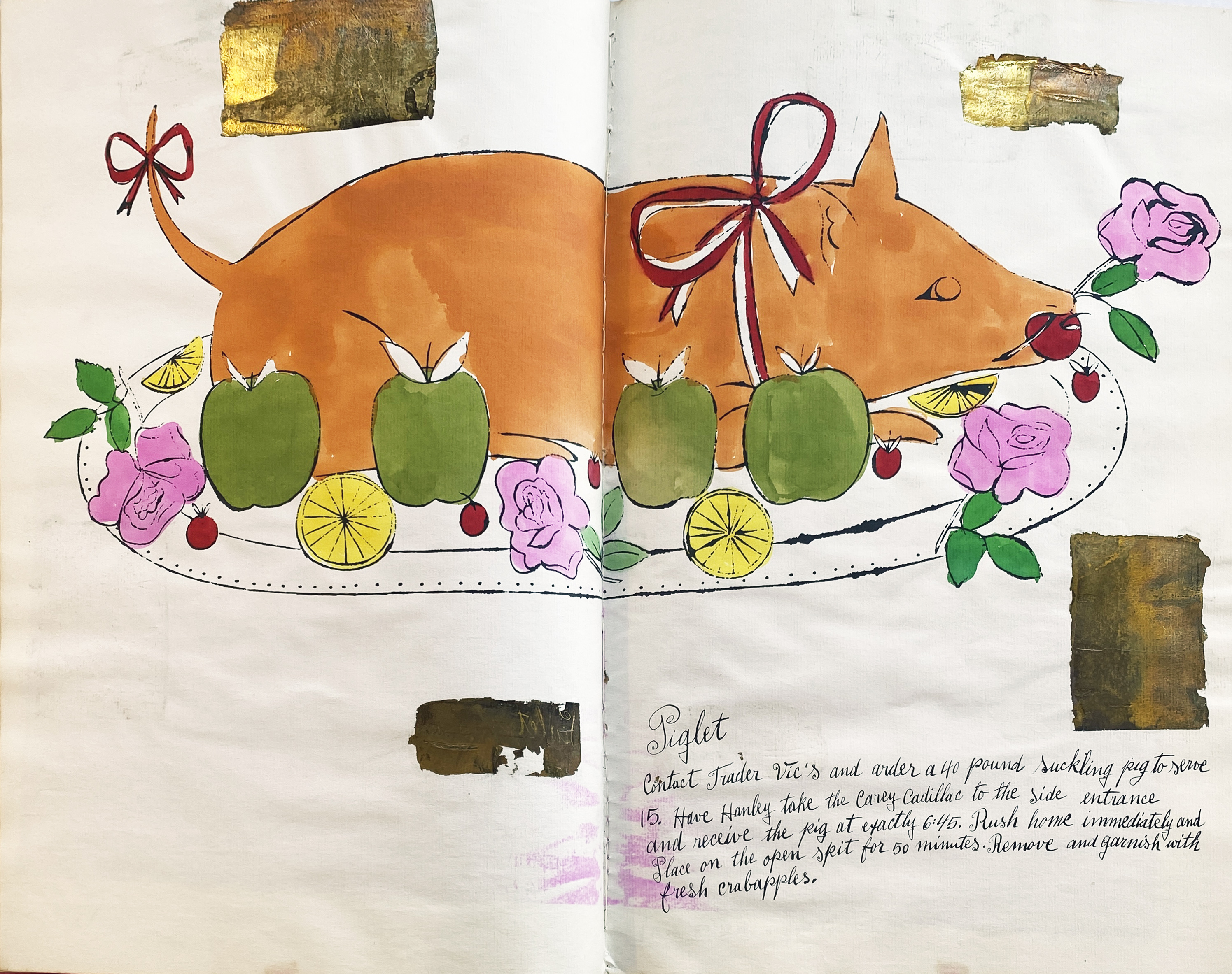 This early commercial work demonstrates Warhol's distinctive blotted line technique and hand-coloring methods that would later influence his Pop Art aesthetic. Created as part of a whimsical cookbook collaboration, the piece showcases his transition from commercial illustration to fine art through its combination of lithographic printing with luxurious gold leaf embellishments.