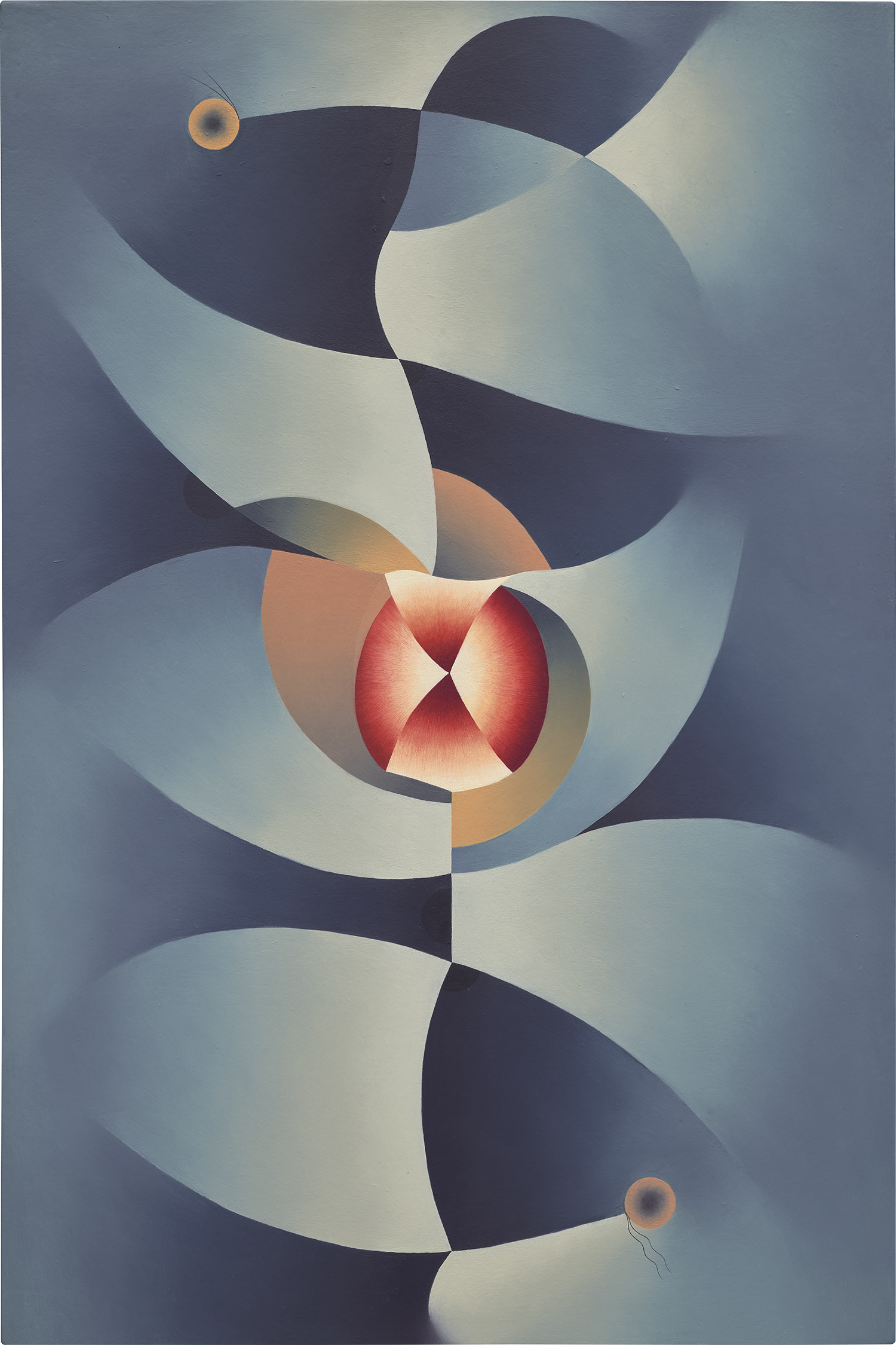Angela Heisch's 'Egg White Blue' from 2019 is an oil on canvas laid on panel, exploring color relationships and abstract forms. The work demonstrates the artist's contemporary approach to color field painting.