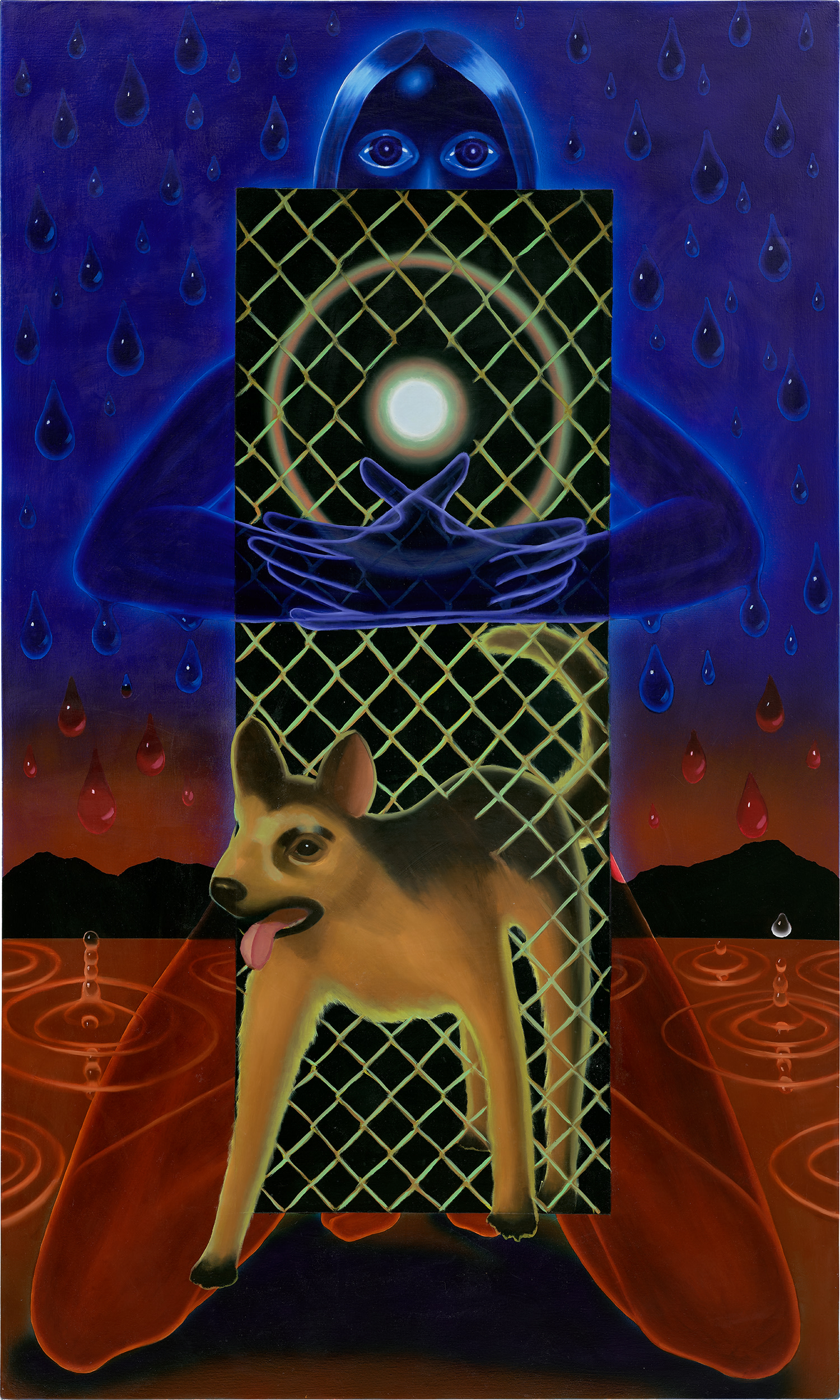 Anja Salonen's 'Moon Dog' is an oil and acrylic composition on canvas created in 2022. The mixed-media approach combines traditional and contemporary painting techniques to create a contemporary artwork.