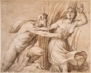 This drawing depicts the mythological pursuit of the nymph Syrinx by the lustful god Pan, rendered in black chalk and brown wash by a follower of Annibale Carracci. The work exemplifies the Baroque draughtsman's skill in capturing dynamic movement and emotional drama through fluid linework and tonal modulation, though the composition's attribution has shifted over time, as evidenced by the pencil notation crediting Carlo Cignani. The drawing's provenance traces to a late 19th century English collection, and despite minor losses and age-related toning, it retains considerable vigor in its expression of this classical narrative.