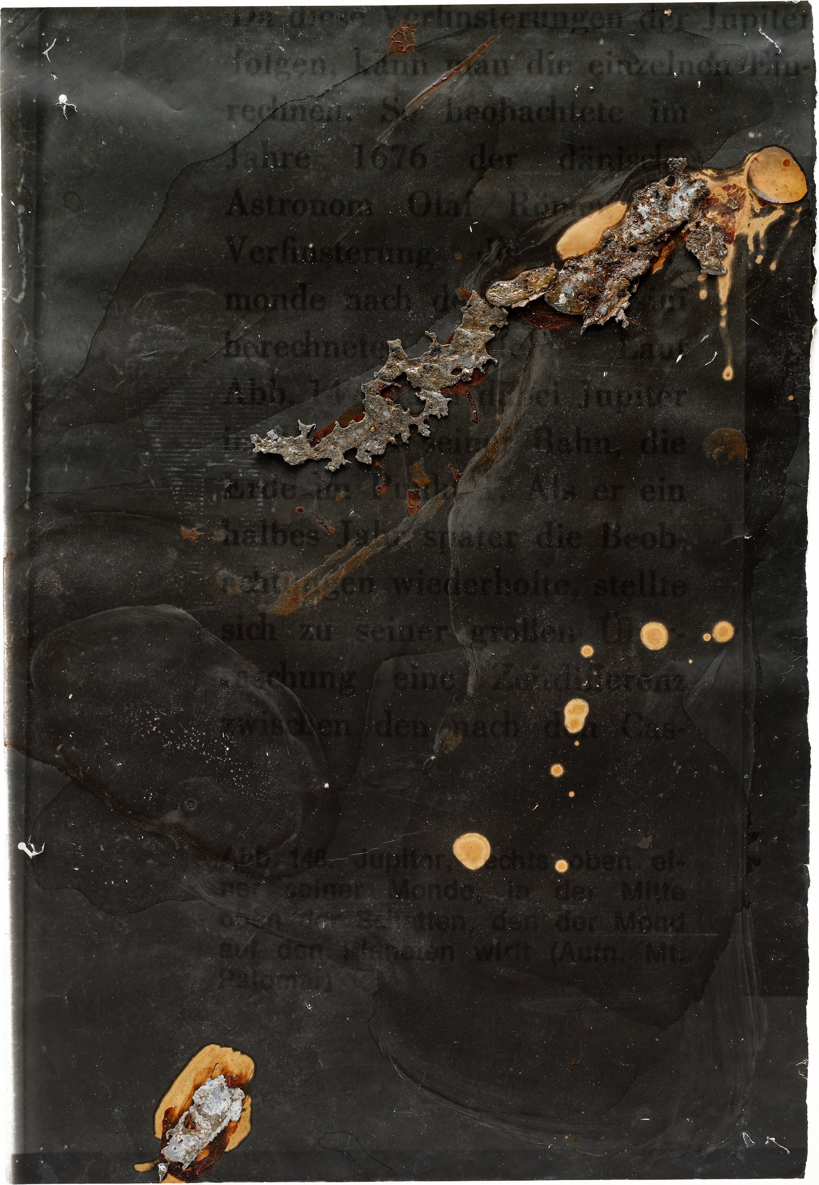 "Komet" exemplifies Anselm Kiefer's characteristic layering of materials and historical references, combining photographic imagery with acrylic, emulsion, shellac, and lead to create a densely textured surface that invites archaeological interpretation. The work engages with themes of German history and collective memory through its accumulation of media, where the physical materiality of lead and other substances becomes inseparable from the work's conceptual content. By employing industrial and traditional materials on a photographic base, Kiefer transforms the photograph into a palimpsest that resists easy legibility while asserting the weight of historical time and material presence.